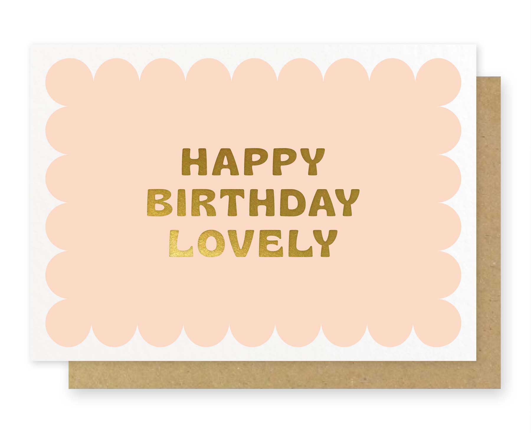 This quite literally lovely birthday card from Lucky Ink features a scalloped frame design with type handprinted in gold foil, giving a luxury debossed finish, on a gorgeous peach coloured background.