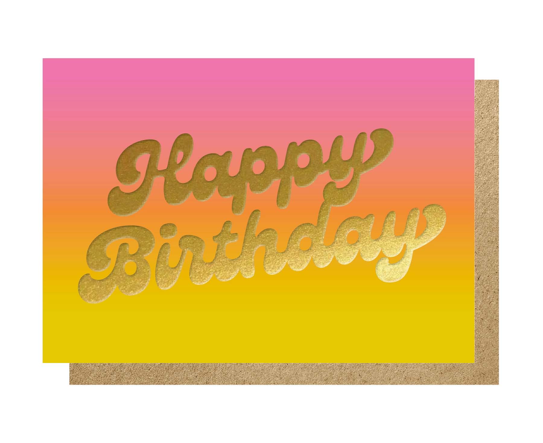 This birthday card from Lucky Ink is as bright as they come with a horizontal hazy pink, peach and yellow graduated ombre background and 'Happyl Birthday' type handprinted in gold foil.