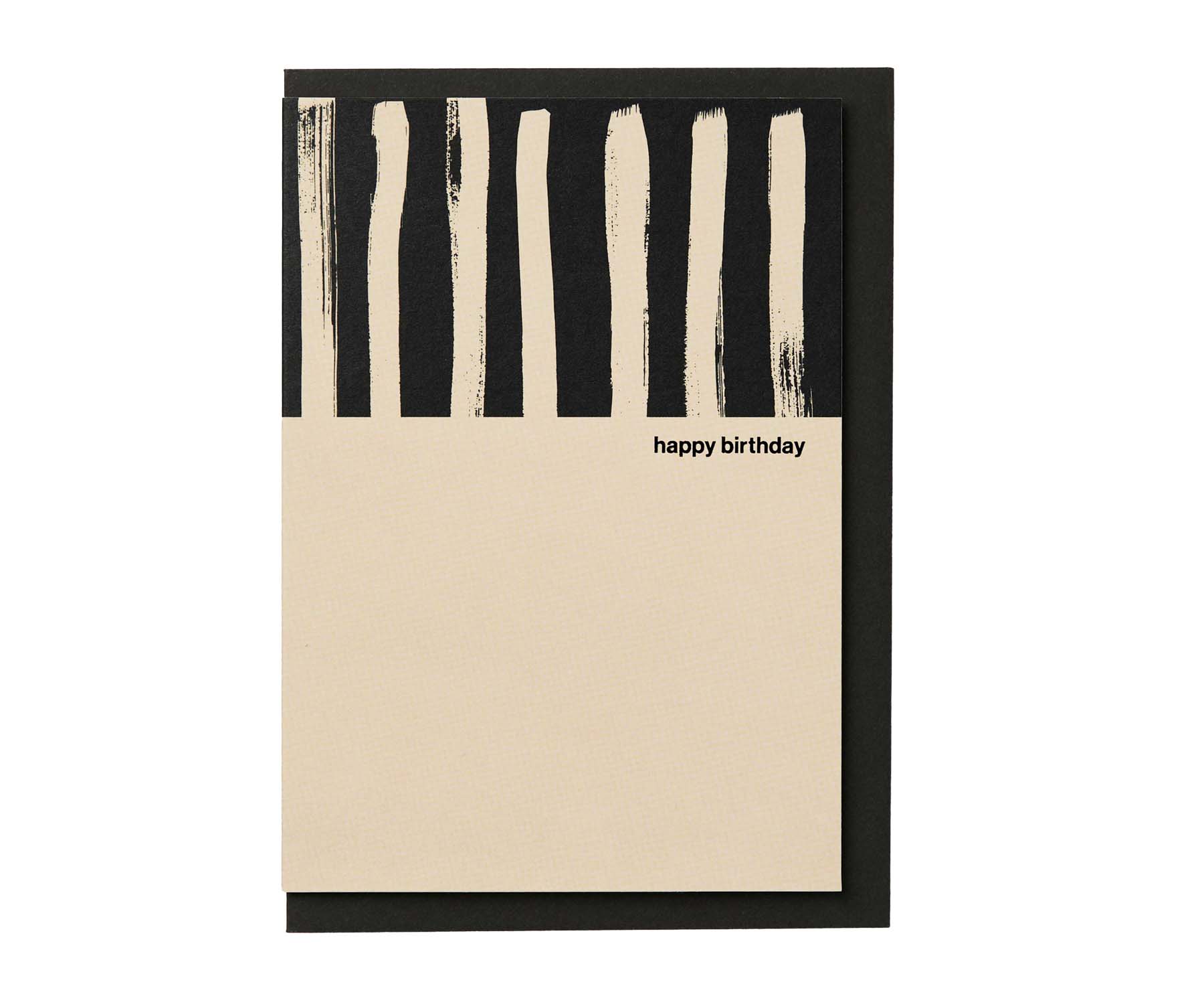 A striking monochrome birthday card featuring painted black lines and 'happy birthday' in a black foil. It is one of Kinshipped's range of gorgeous cards in contemporary neutral tones.