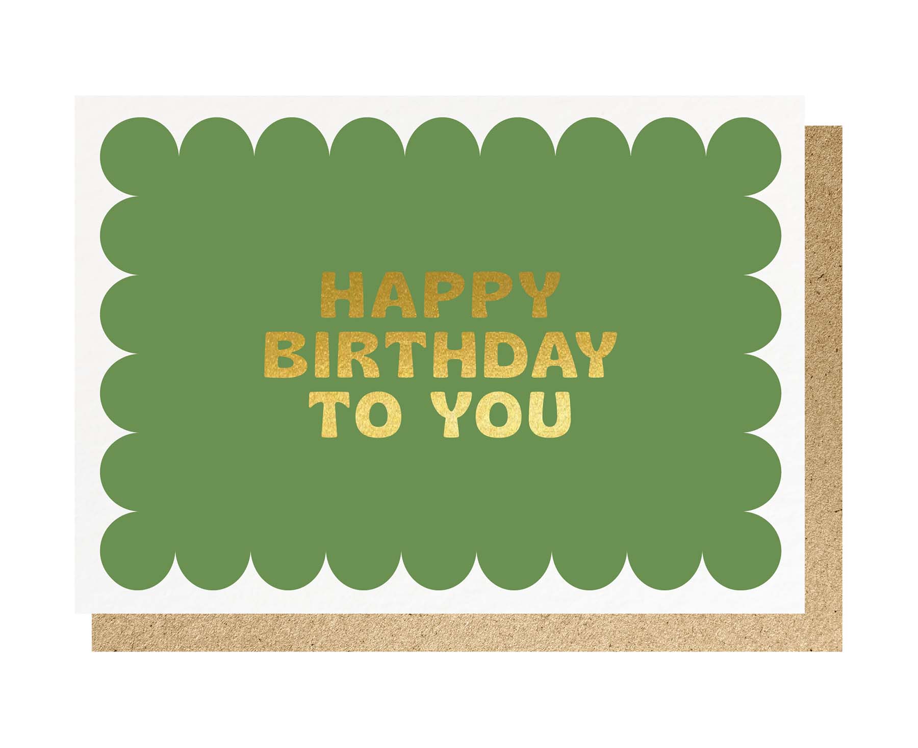 This gorgeous birthday card from Lucky Ink features a scalloped frame design with type handprinted in gold foil, giving a luxury debossed finish, on a rich green coloured background.
