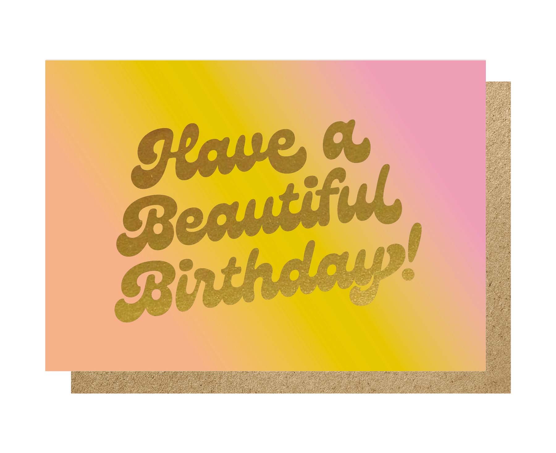 This birthday card from Lucky Ink is as bright as they come with a diagonal hazy pink, peach and yellow graduated ombre background and 'Have a Beautiful Birthday' type handprinted in gold foil.