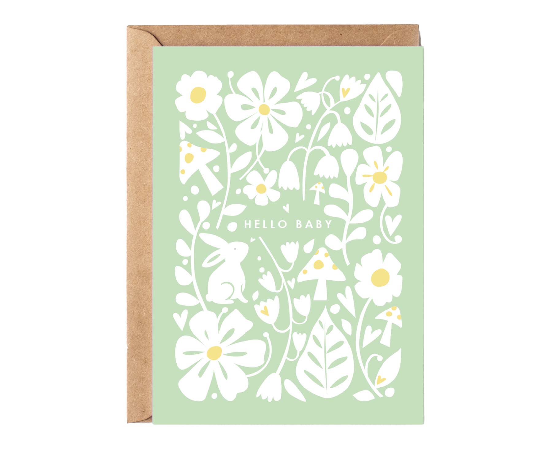 With a beautiful floral pattern in white and yellow on a muted green background with 'Hello Baby' text, this new baby is as delicate as the new arrival it celebrates. It's part of Happy Street's Secret Garden range which features floral designs with bold composition and rich colours.