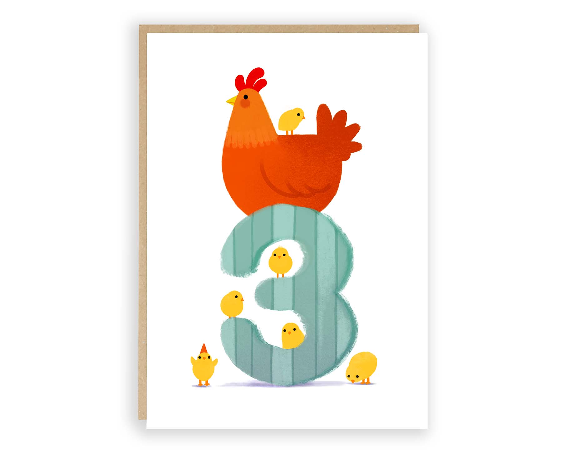 Part of a range of cards designed by Jade Fisher's brother Adam, this beautifully illustrated hen and family of chicks third birthday card is the perfect card for any animal loving three year old!
