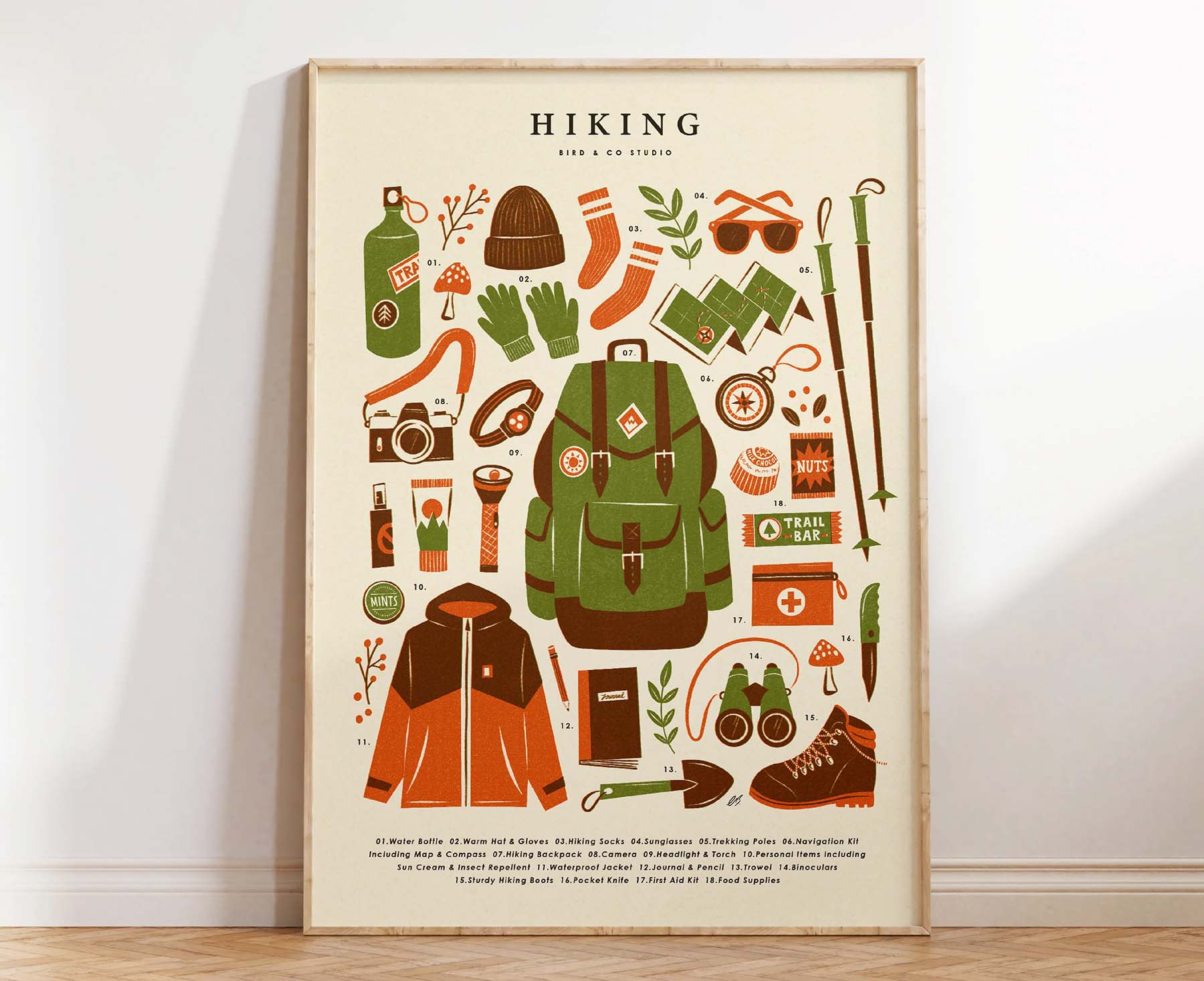Inspired by vintage collection charts and designed in a colourful risograph style, this beautiful Hiking Kit print from Bird & Co is full of delightful details including a rucksack, gloves, map, compass, walking boots, coat and many other hiking essentials. Great as a gift for someone who loves nothing more than a big long hike, it reveals something new every time you look at it. Supplied unframed, but would look stunning in a natural solid oak picture frame.