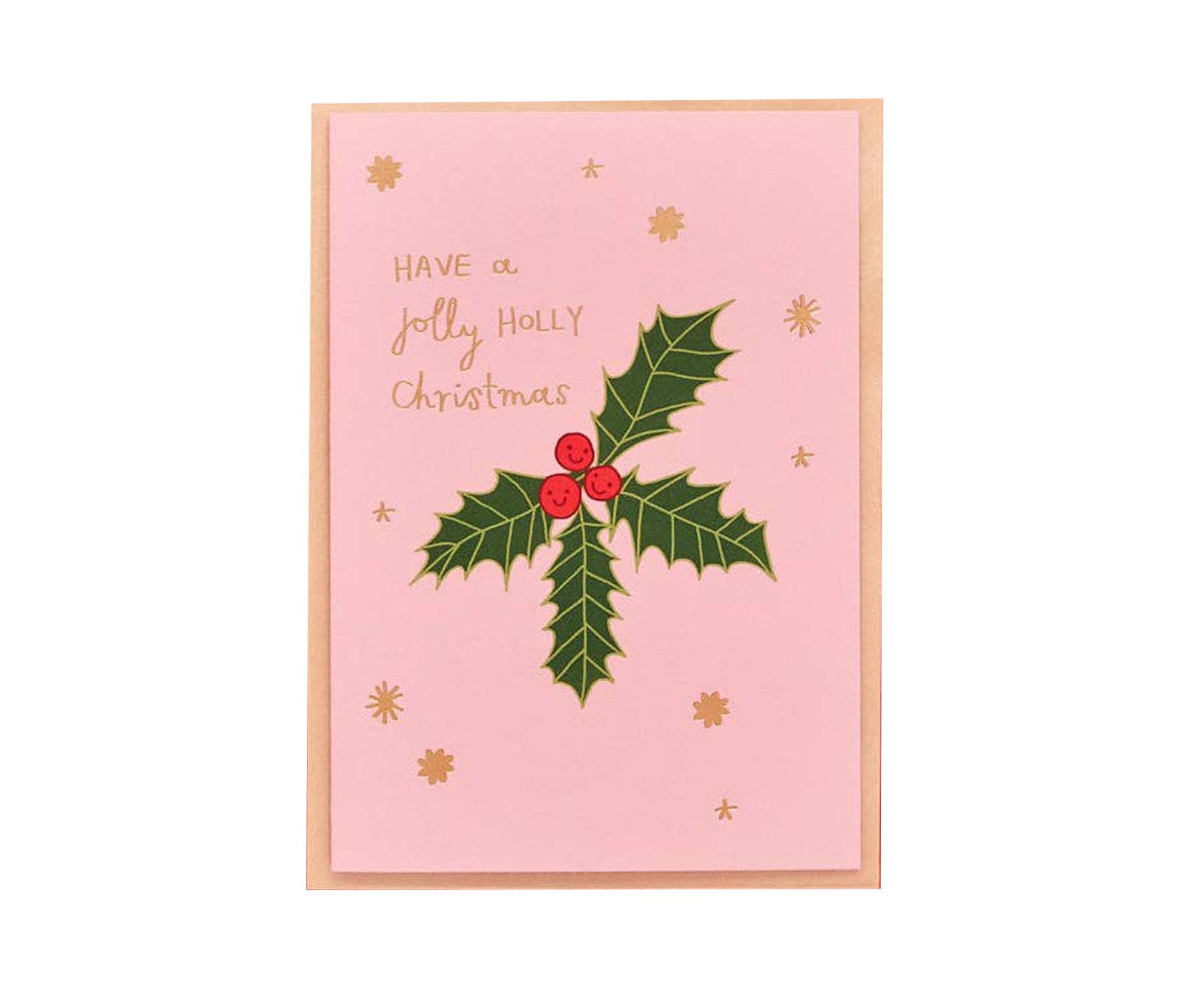 Featuring festive green holly with cute smiling red berries, this card is beautifully illustrated and features a hand written message in gold foil that reads 'Have a jolly holly Christmas!' It comes with a coordinating gold envelope.
