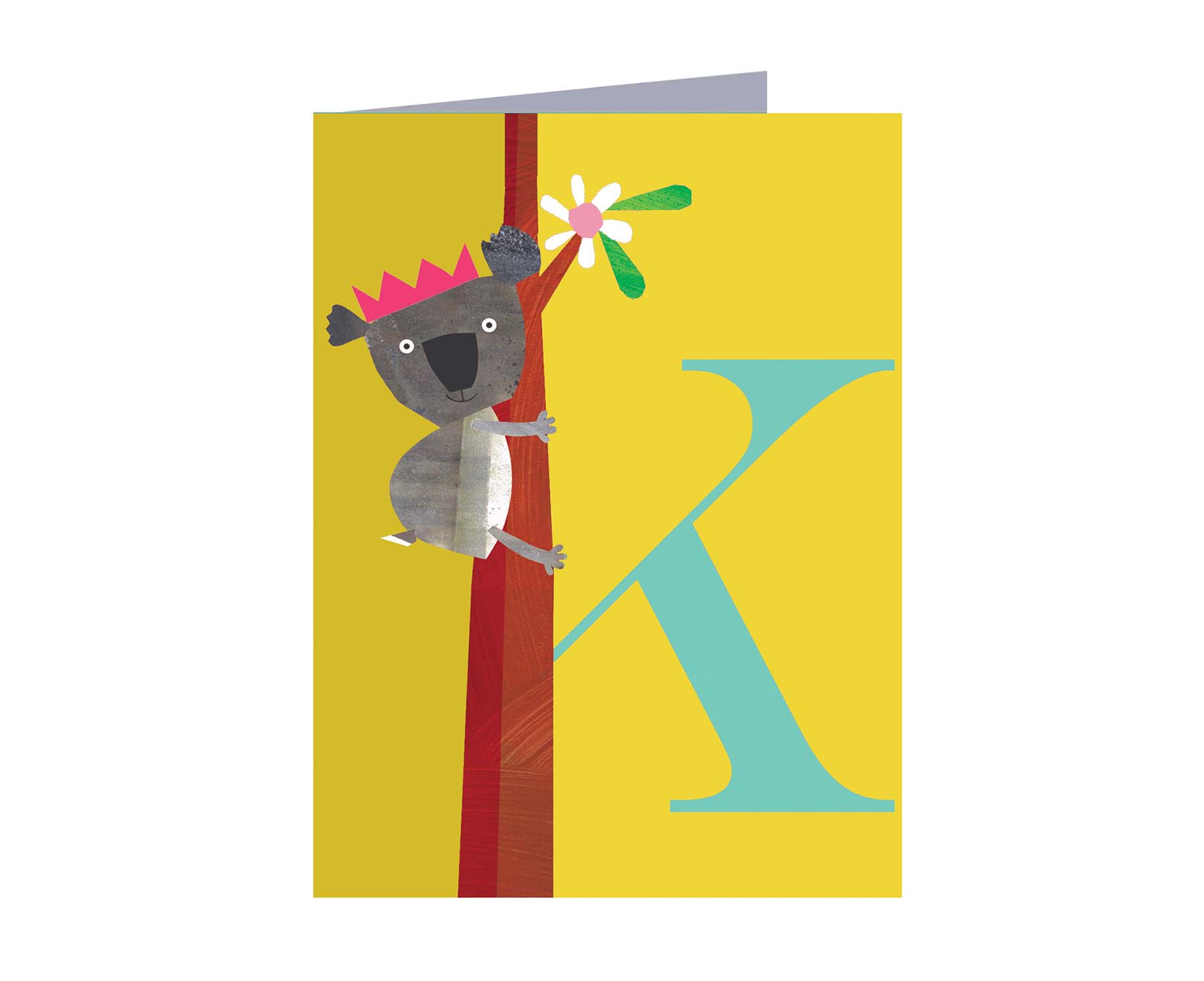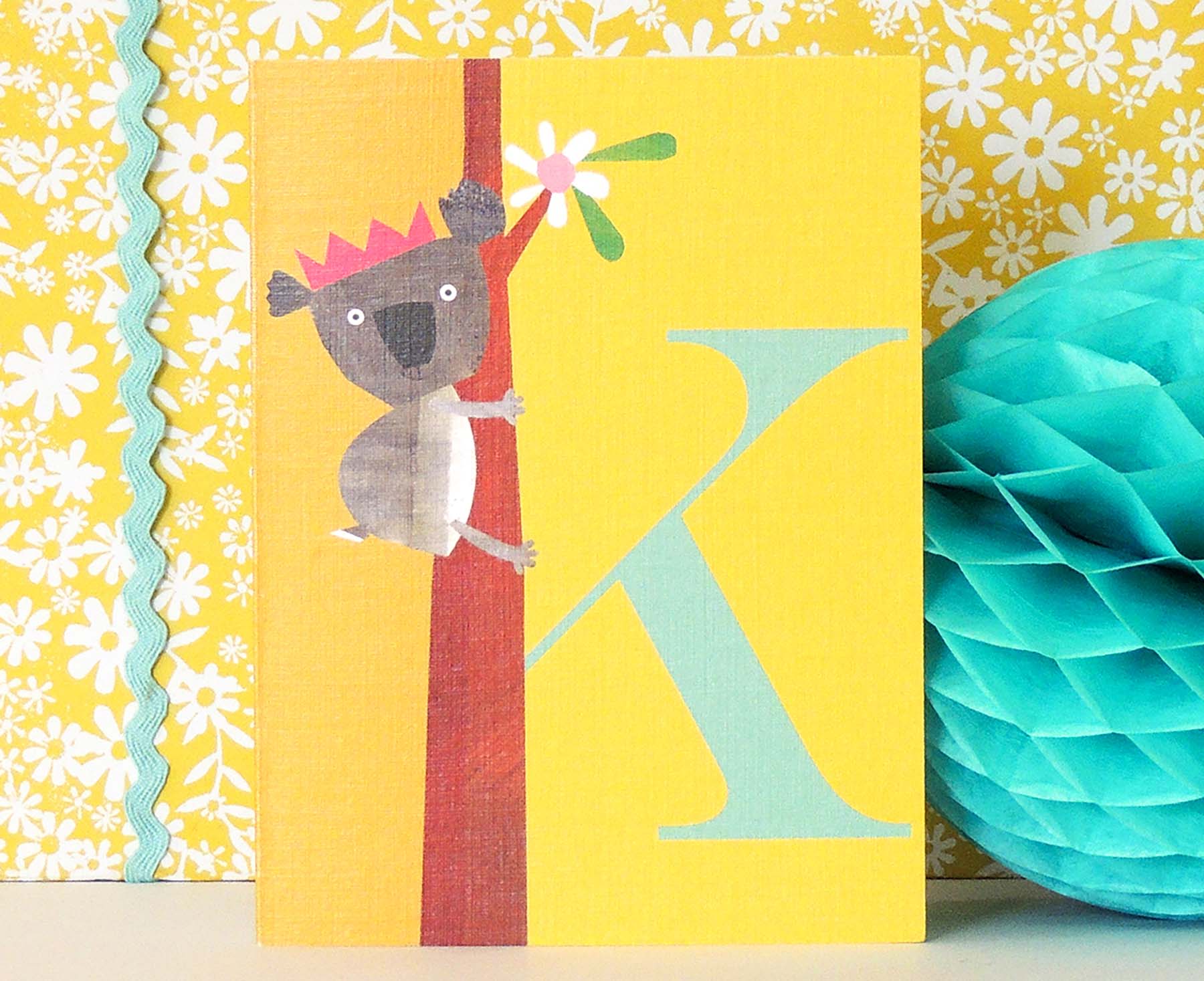 This beautifully drawn K for Koala mini letter card is part of Kali Stileman's fabulous Tiddly Letter range, printed on tactile and lovely linen textured card. Their dinky size (and price) makes them ideal to combine into names or words to go on a little one's wall or shelf!