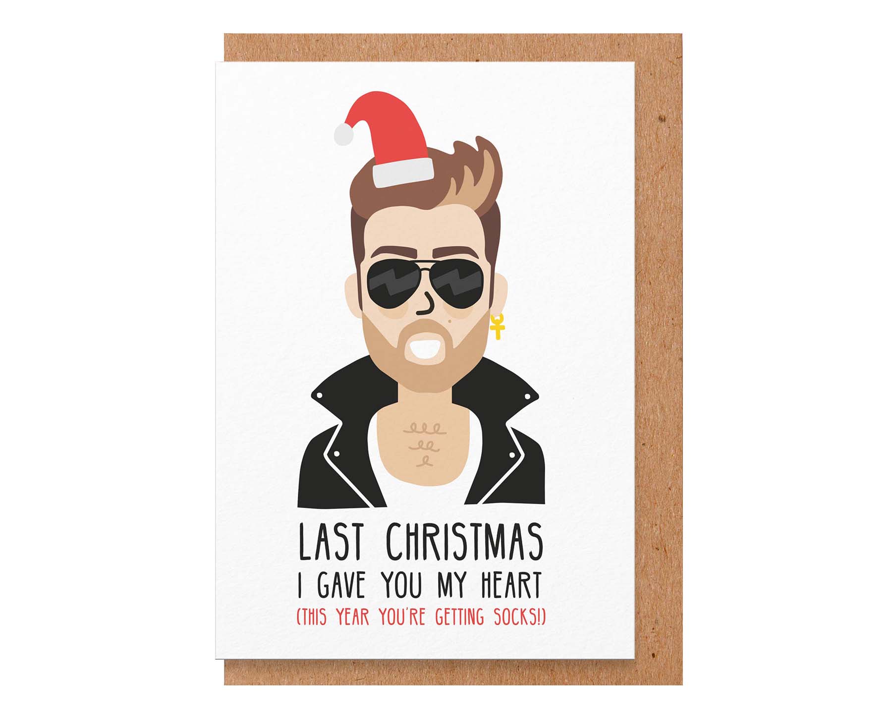 Save the heartbreak this year and just give them socks! This is the alternative message from the Wham classic 'Last Christmas' that features on this card, complete with a festive yet still cool George Michael. It's one of the many fun and brilliantly illustrated Christmas cards from Studio Boketto,