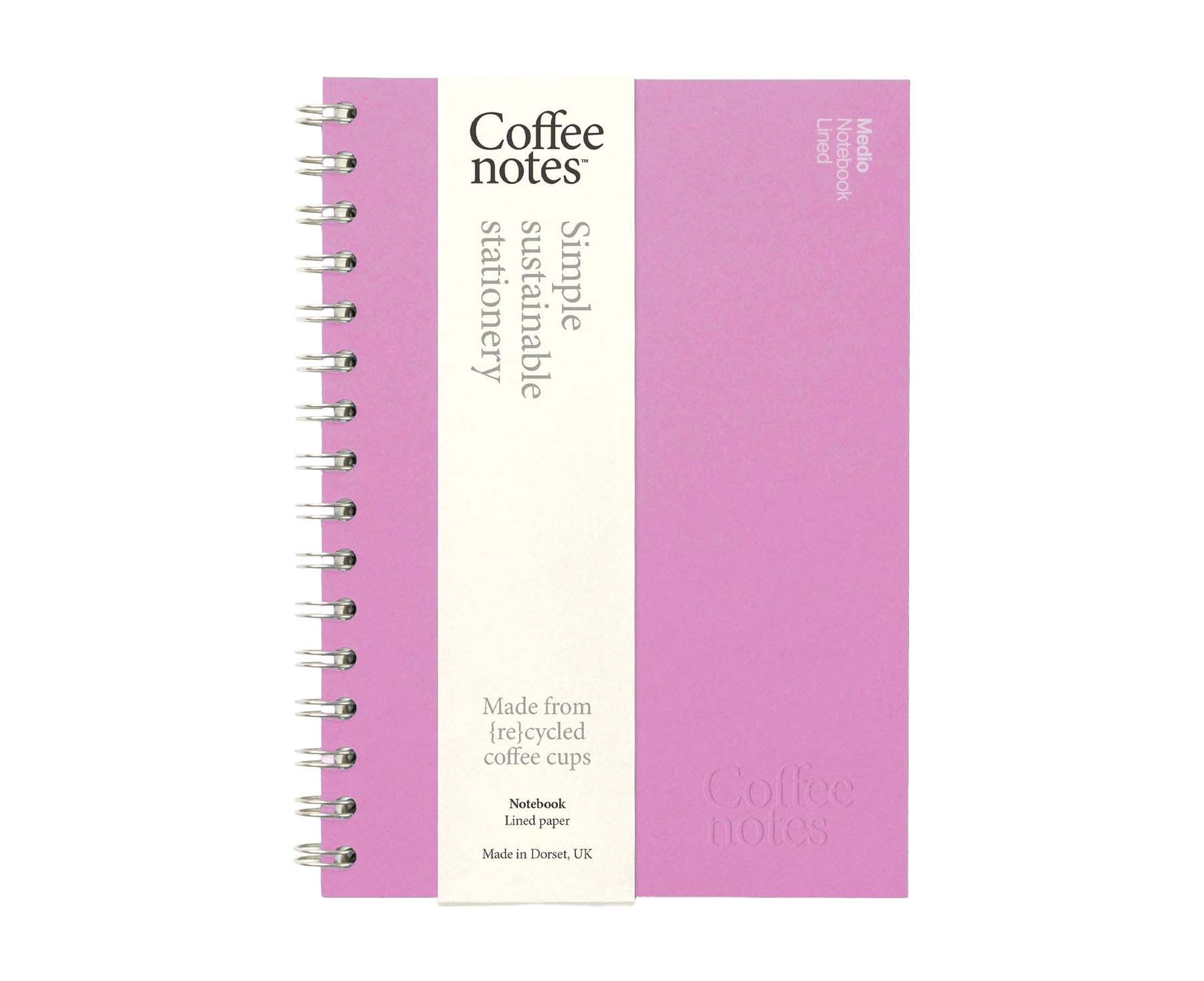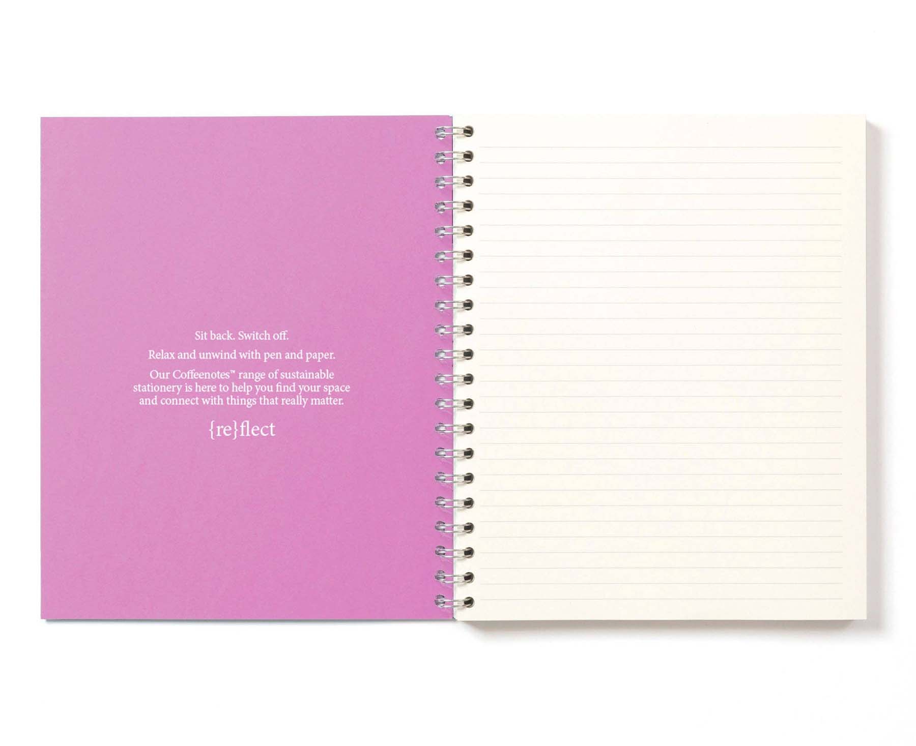 A5 (148mm x 210mm) wirebound notebook. 300gsm cover made from a mix of recycled and certified sustainable fibres, 160 lined inner pages 106gsm, made up of upcycled coffee cups, waste from coffee cup manufacture and virgin fibres.