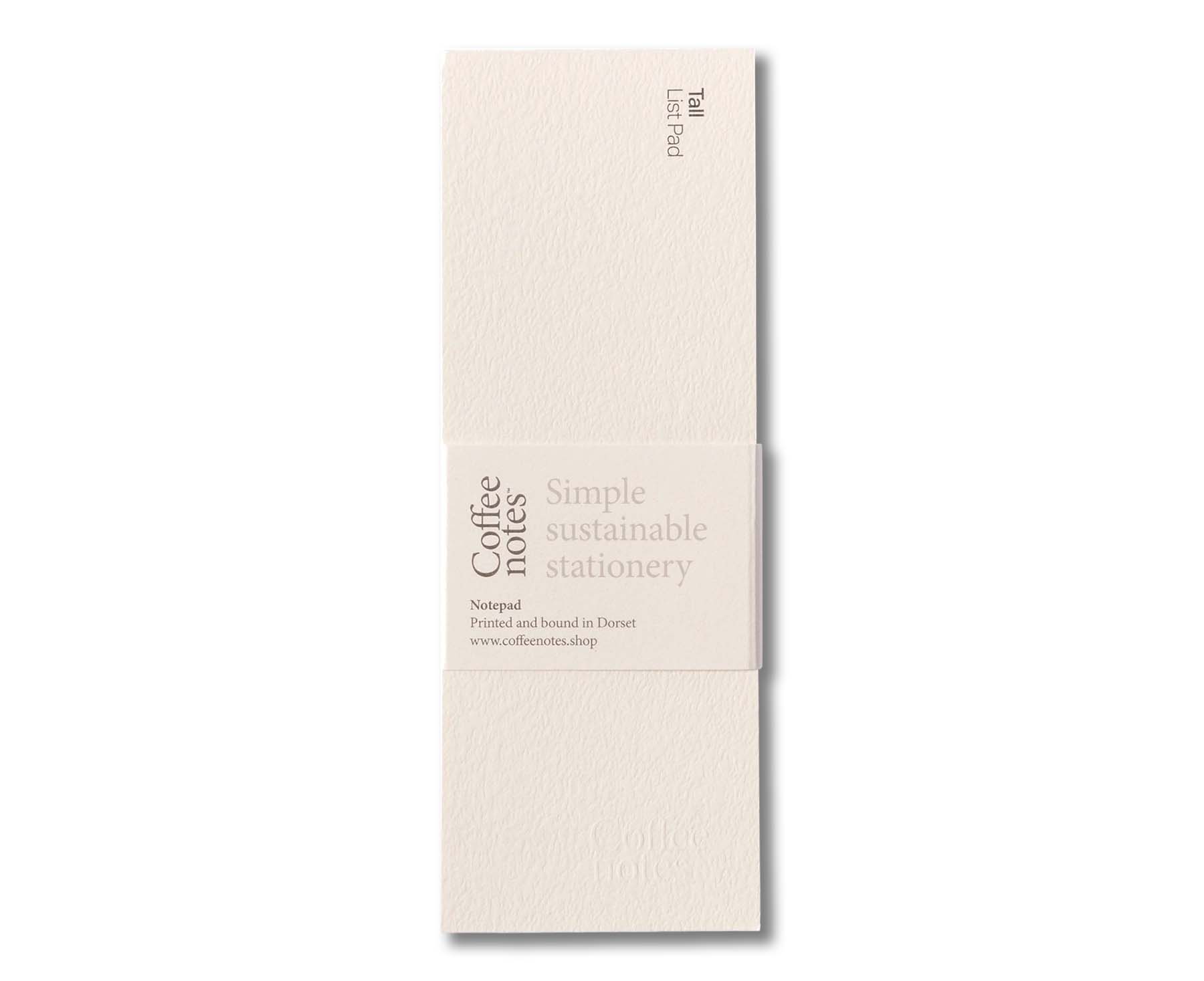 74mm x 210mm tall list pad. 320gsm cover made up of upcycled coffee cups, PIW from coffee cup manufacture, virgin fibres. 60 tear off pages 106gsm, made up of upcycled coffee cups, waste from coffee cup manufacture and virgin fibres.