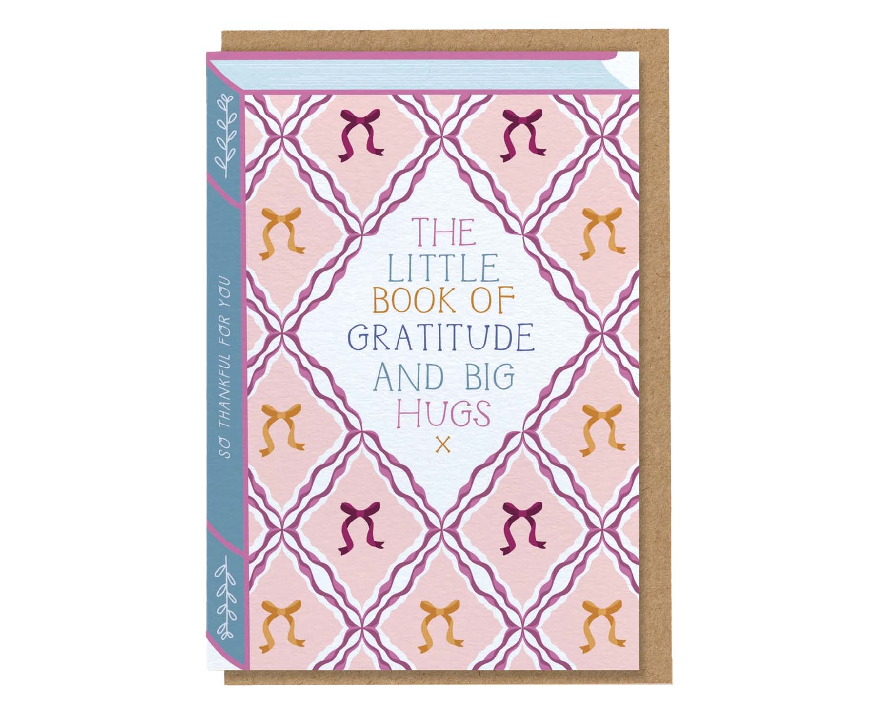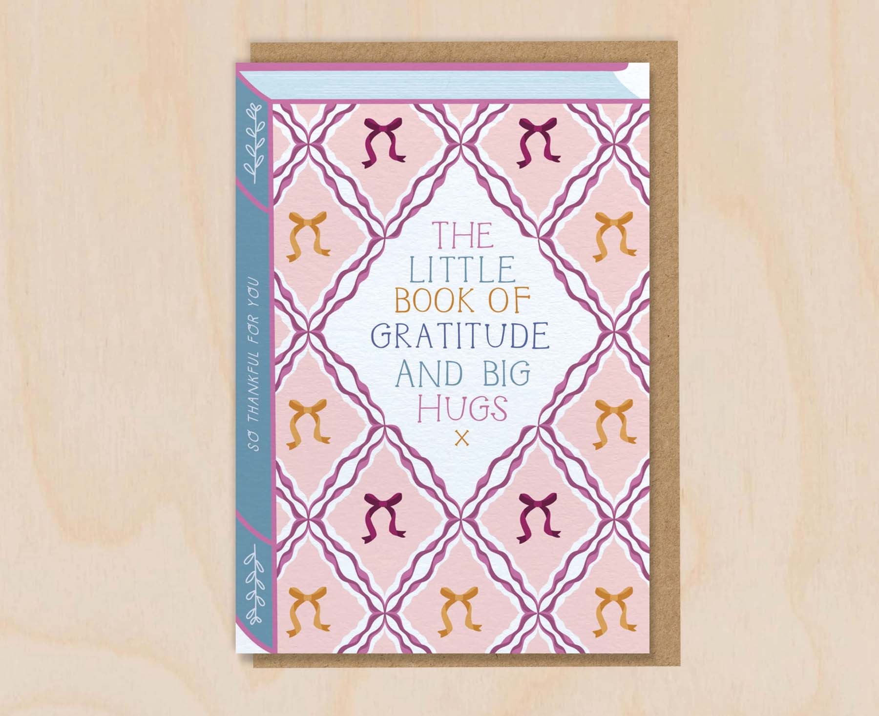 Inspired by classic book covers, this beautifully illustrated thank you card features a ribbin and bows design with hand lettering that says 'The Little Book of Gratitude and Big Hugs' with an additional message on the spine - 'so thankful for you.' There's a gorgeous complementary bows design printed on the inside. It's one of many book inspired designs by Two for Joy Illustration.