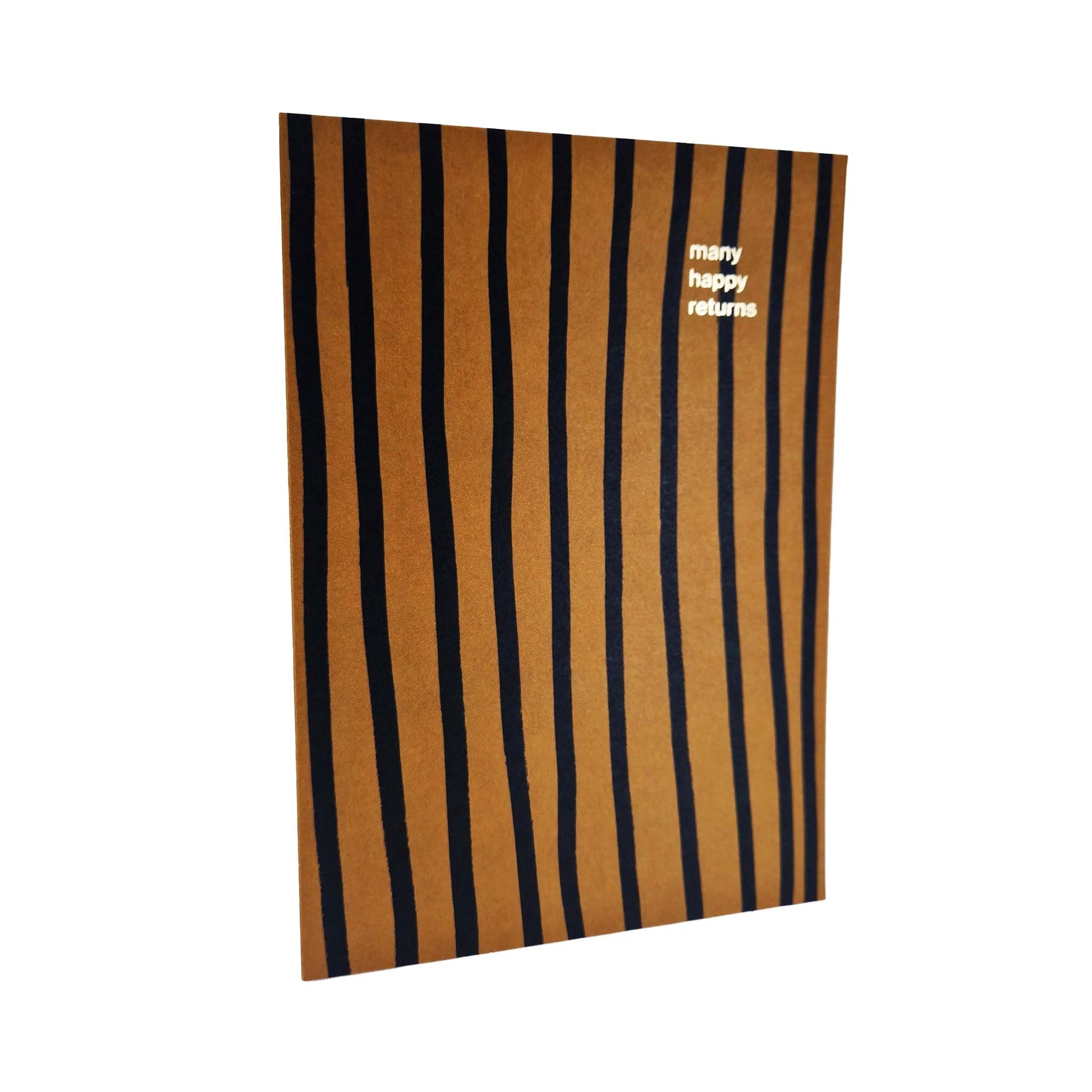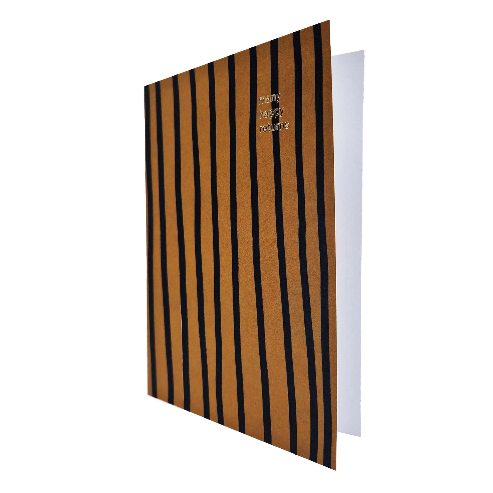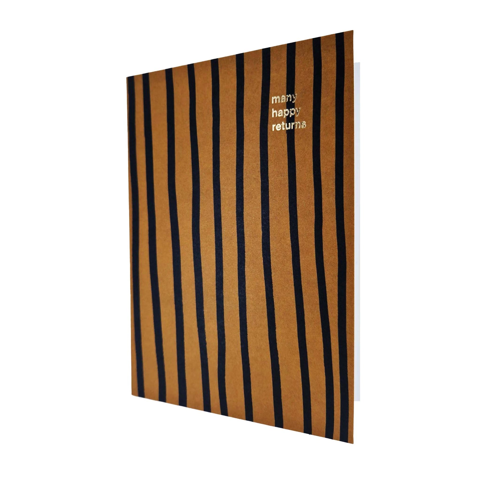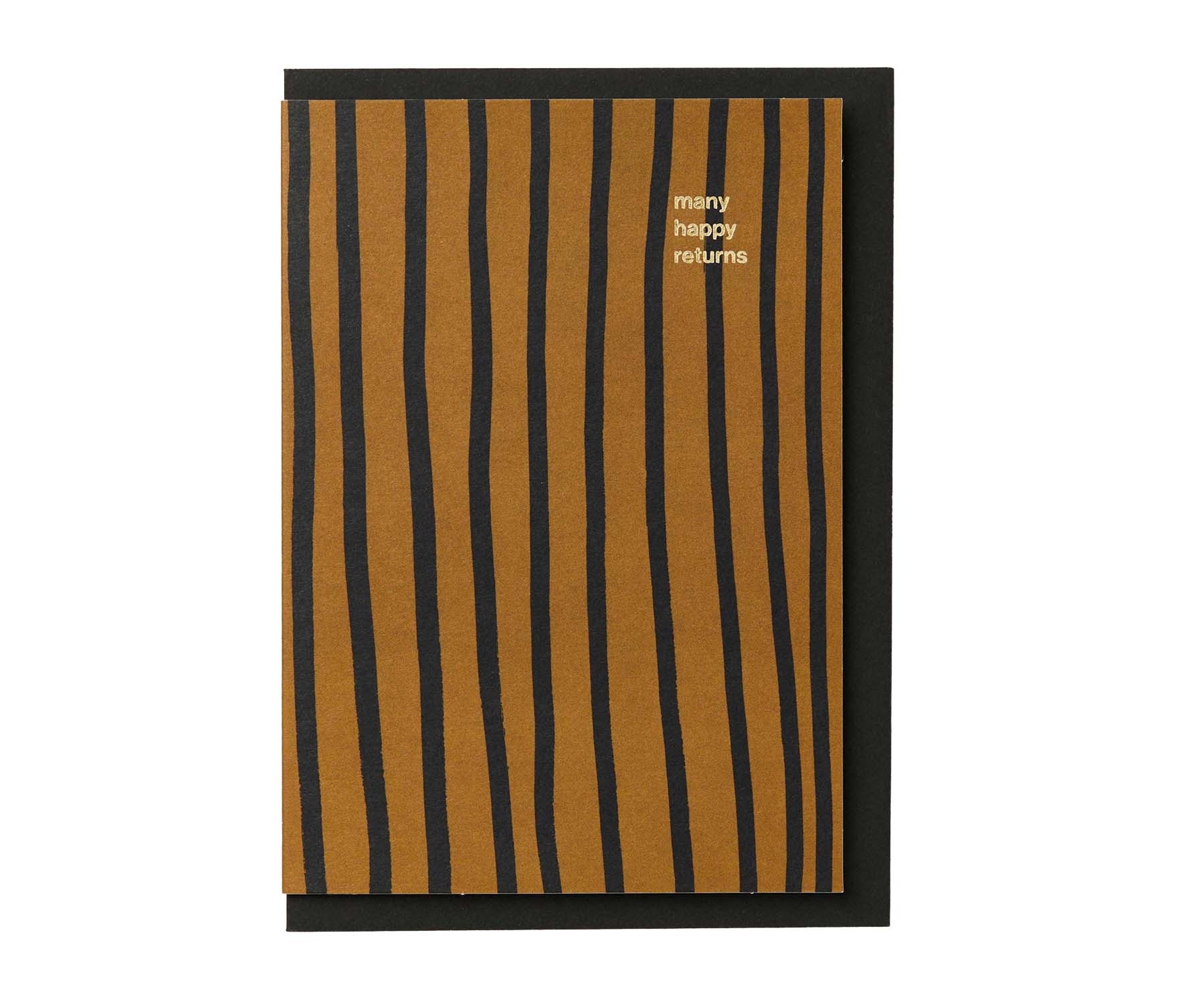 Featuring a brushed rust and black stripes design with 'many happy returns' in gold foil, this birthday card is one of Kinshipped's range of gorgeous cards in contemporary neutral tones.