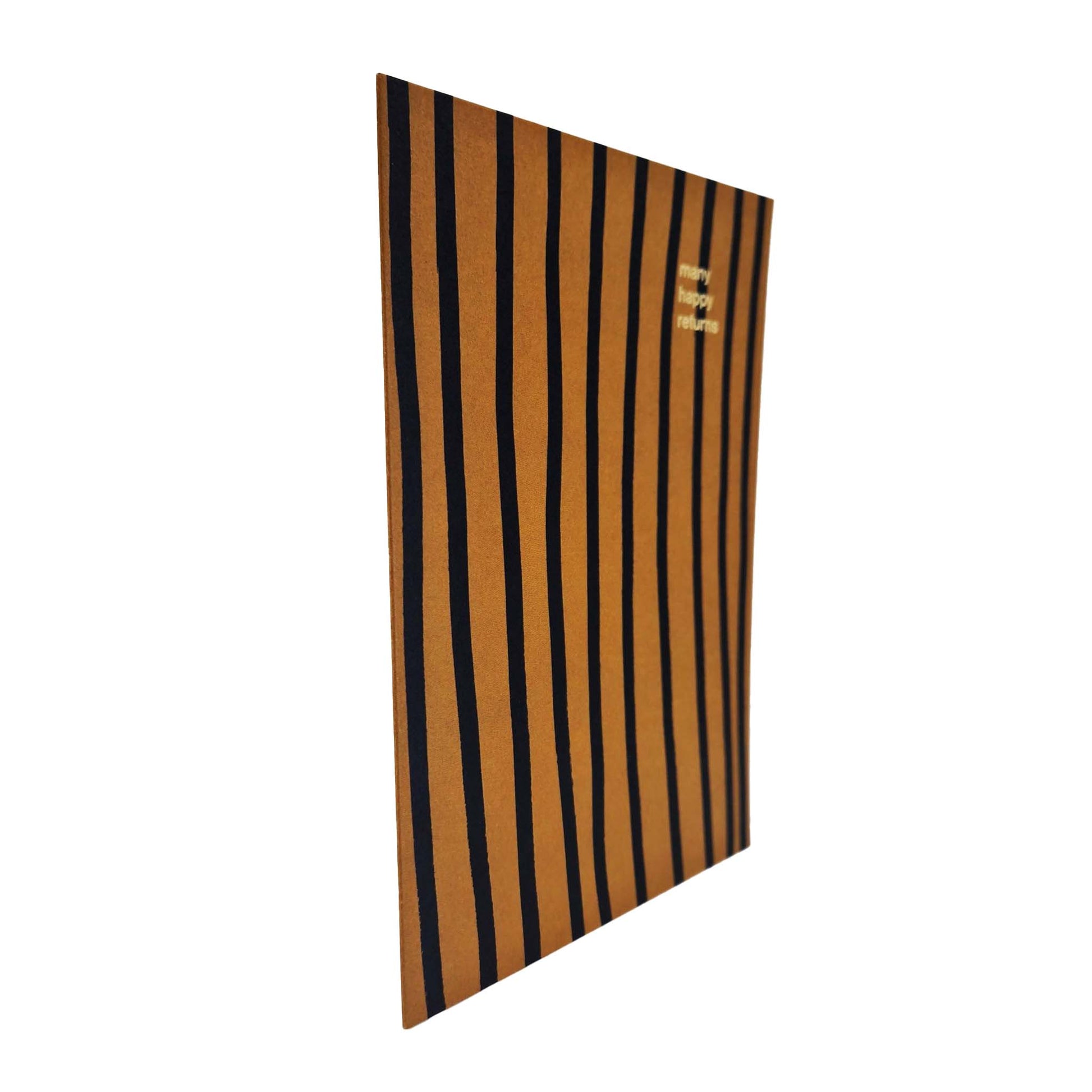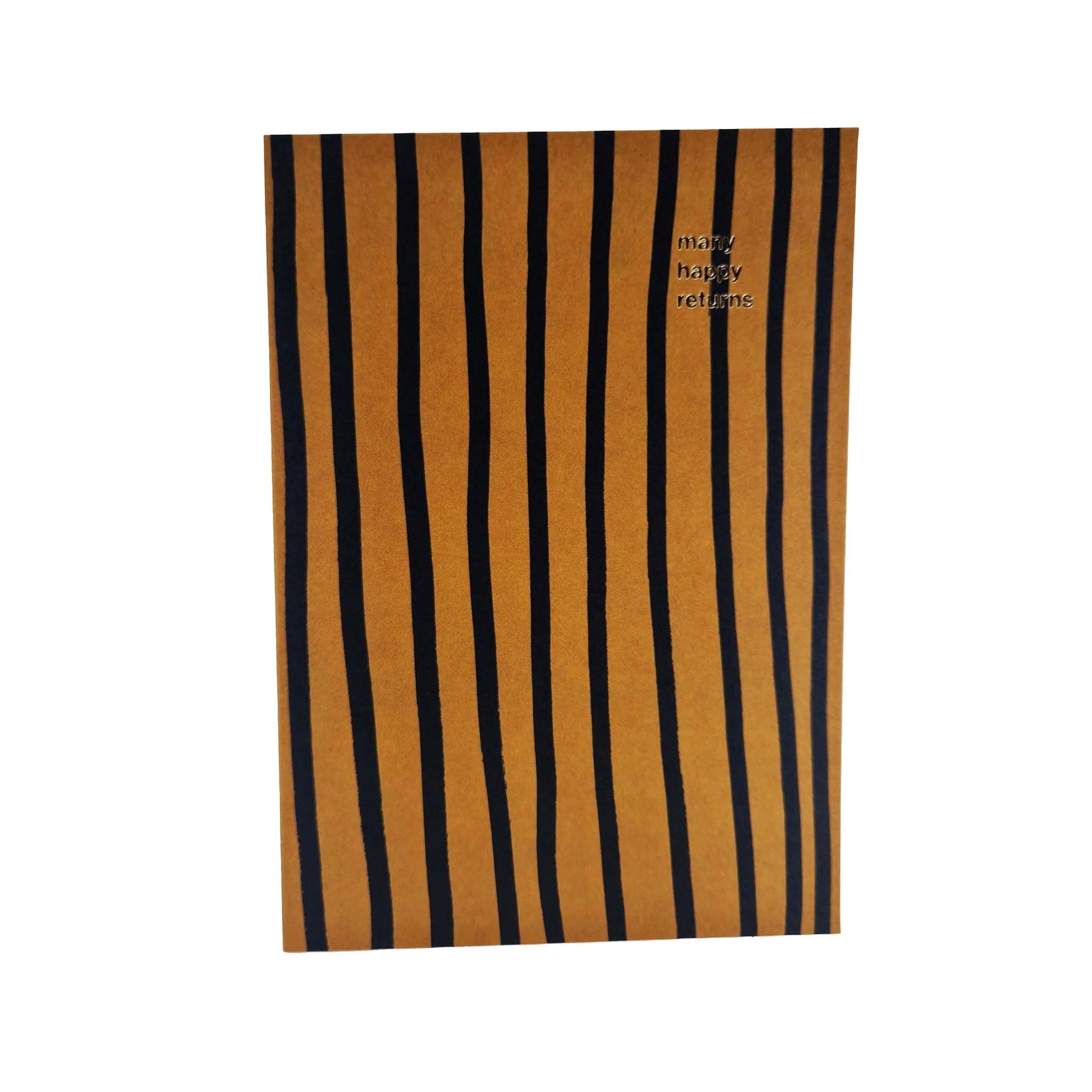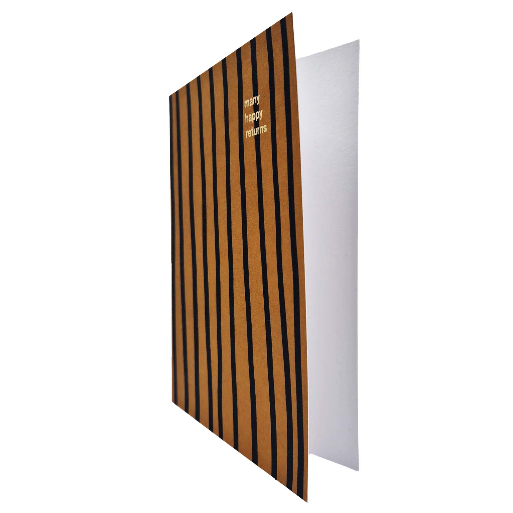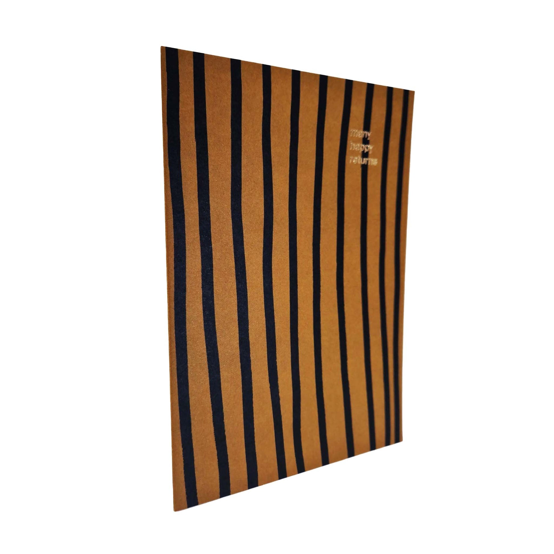Featuring a brushed rust and black stripes design with 'many happy returns' in gold foil, this birthday card is one of Kinshipped's range of gorgeous cards in contemporary neutral tones.