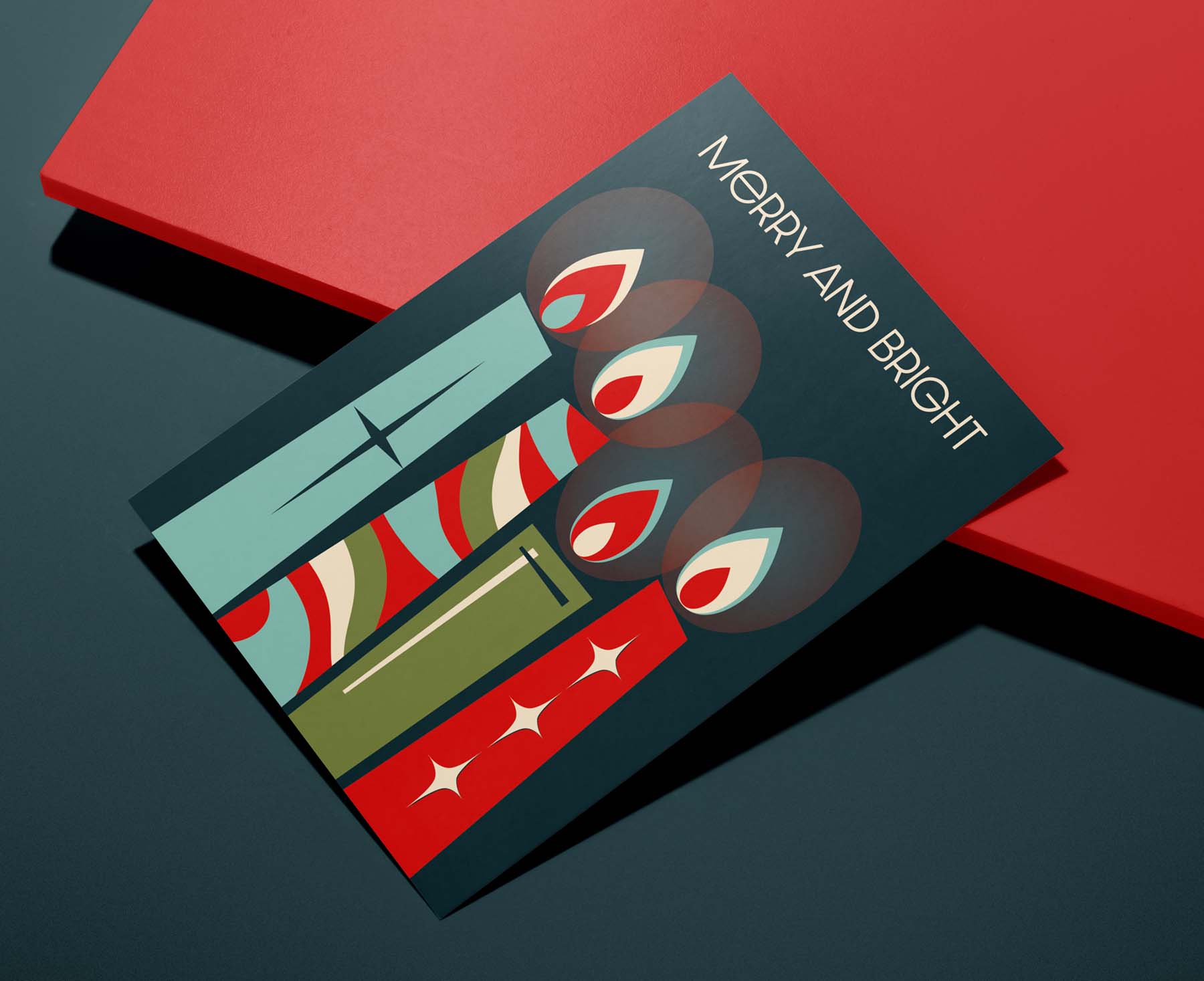 This mid-century (and Two Ronnies) inspired Merry and Bright Christmas card by Manchester illustrator and pattern designer Gail Myerscough features four candles (fork handles?) each with their own pattern and colour palette. Gail's bold and unique designs will bring a touch of vintage style to your Christmas.