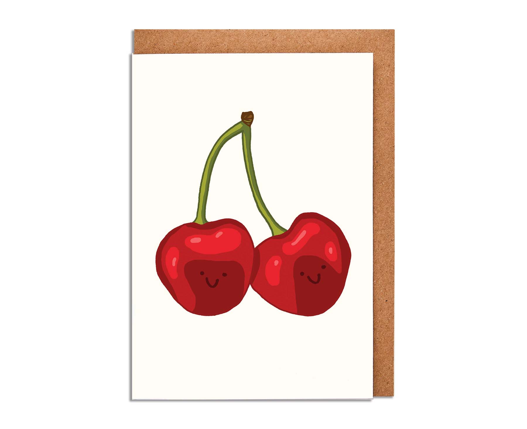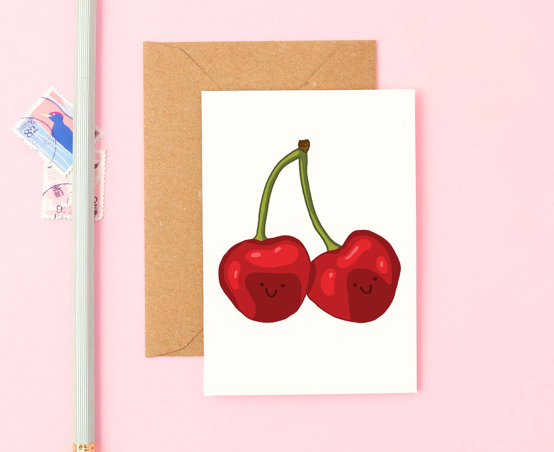 This Mini Cherries Card features a playful hand-drawn illustration of two smiling cherries - perfect for friendship, love, thank-yous, or just because. Its mini size makes it ideal as a gift topper, note card, or party favour.