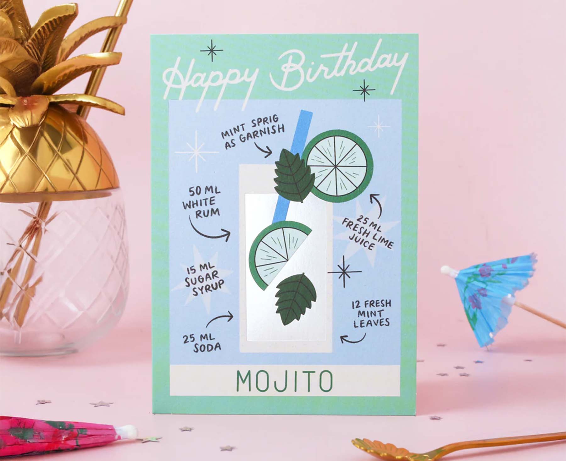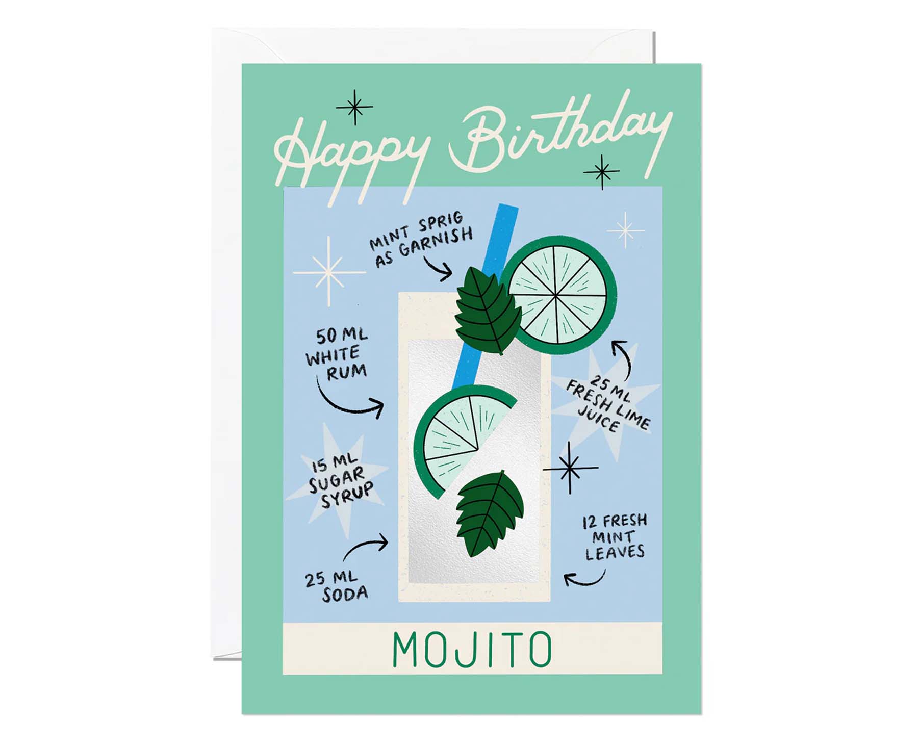 One of a range of foiled cocktail cards designed in collaboration with Megan Roy, this Mojito cocktail birthday card has sumptuous silver foiling and tells you all you need to make this classic cocktail. Like all Ricicle Cards it is printed in the UK on sustainable stock and comes with a suitably luxurious envelope.