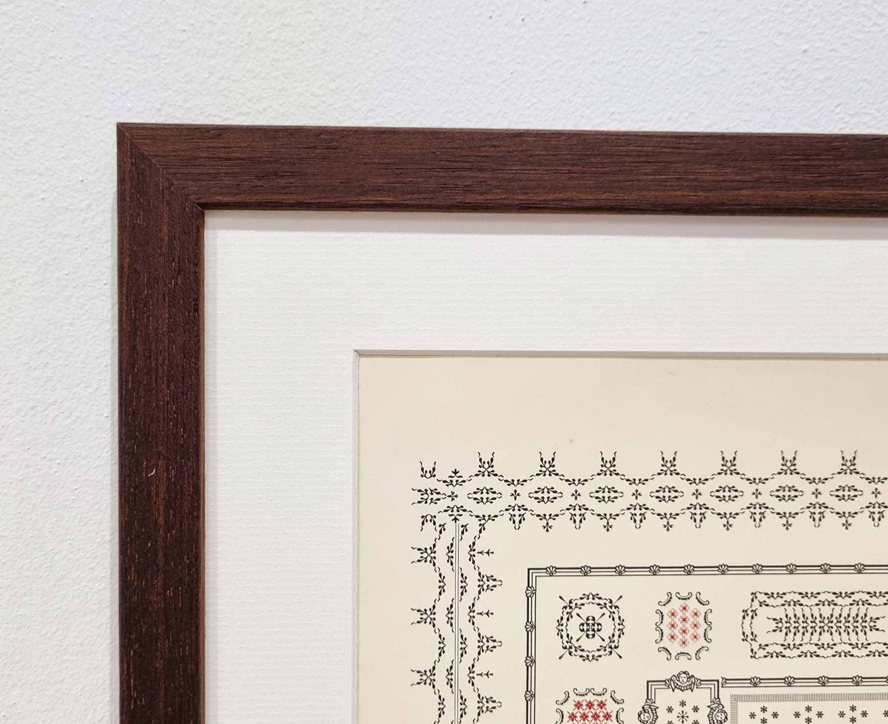 Framed with a 40mm wide off white mount in a 19mm wooden frame with a dark walnut stained finish, supplied ready to hang.