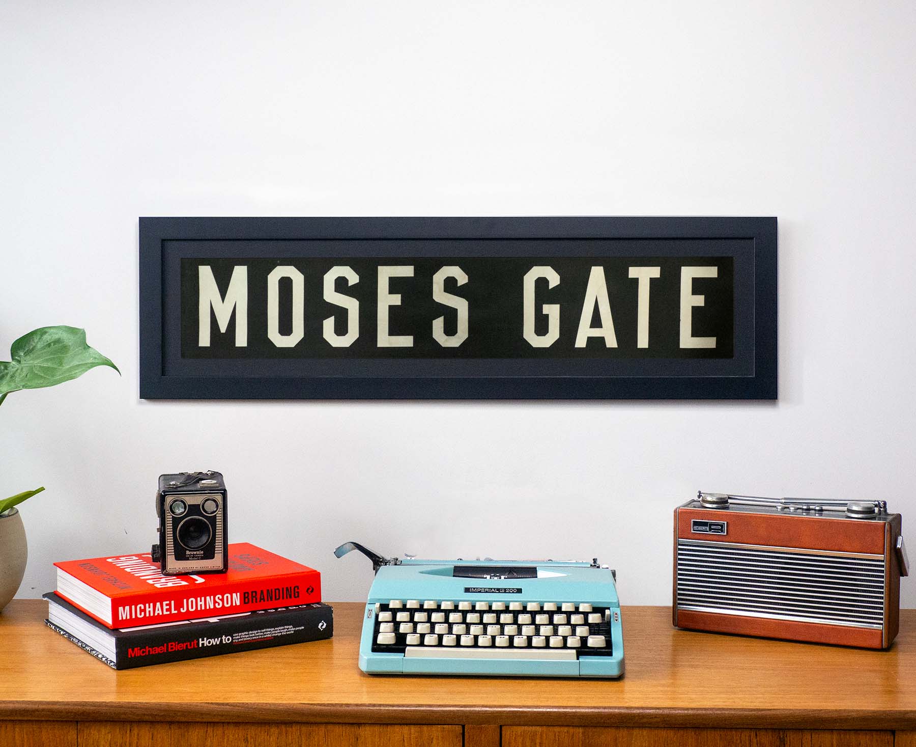 An original from the 1960s, this rather beautiful linen Moses Gate bus blind is from a route covering large parts of Lancashire and beyond. Moses Gate is well known in the Farnworth area of Bolton for Moses Gate Country Park. Its name comes not from the guy who did that sea parting party trick in the bible, but from a corruption of the old English words mosses, meaning peaty or marshy land, and gata, meaning way across, so the park is a way across the marshes. This bus blind has signs of its age, such as discolouration and other marks, but this just makes it even more attractive.