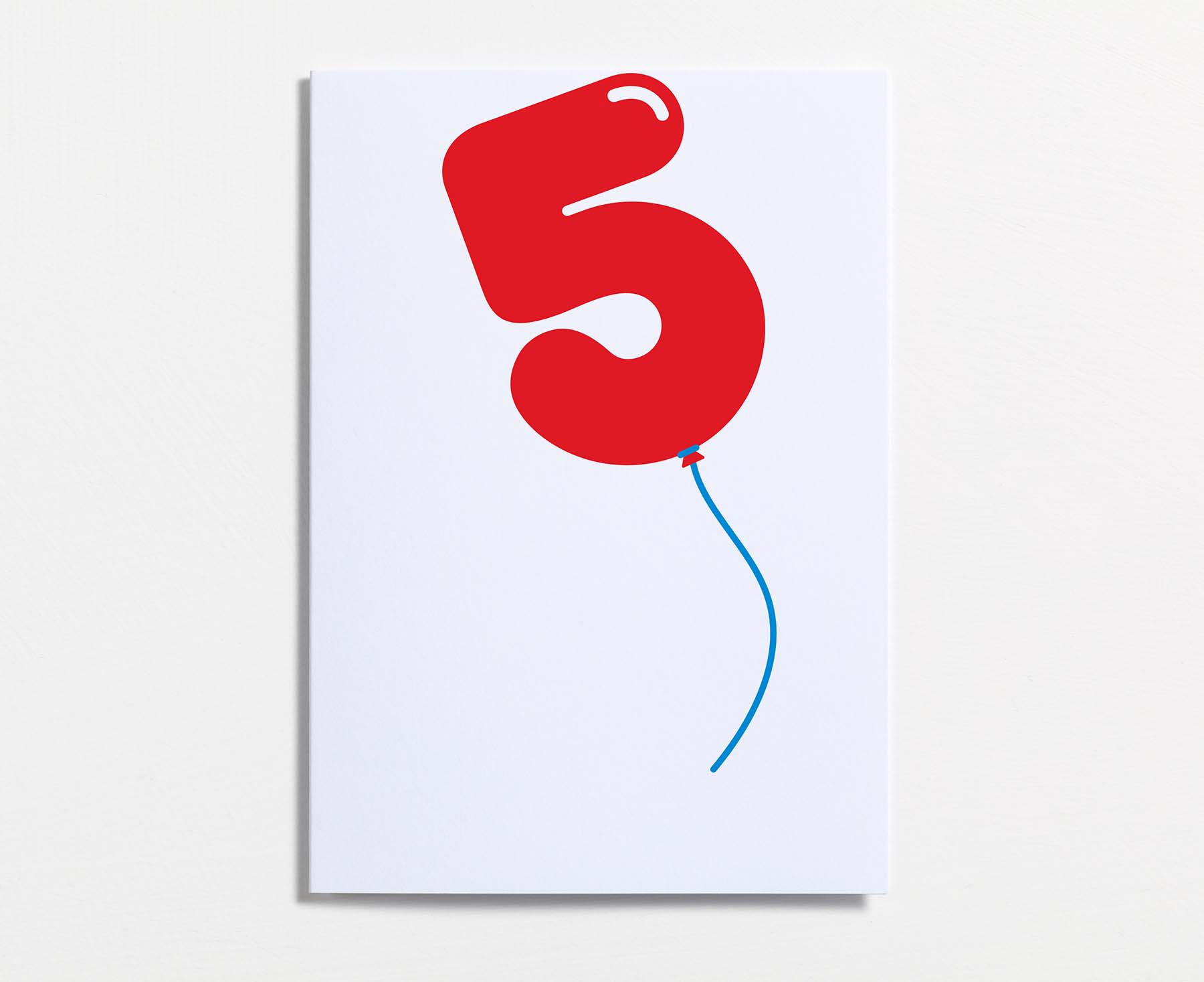 Featuring a big balloon in Crispin Finn's distinctive two colour style, this playful and fun 5th Birthday Card could work just as well as an anniversary card or to mark any other numbered milestone or achievement.