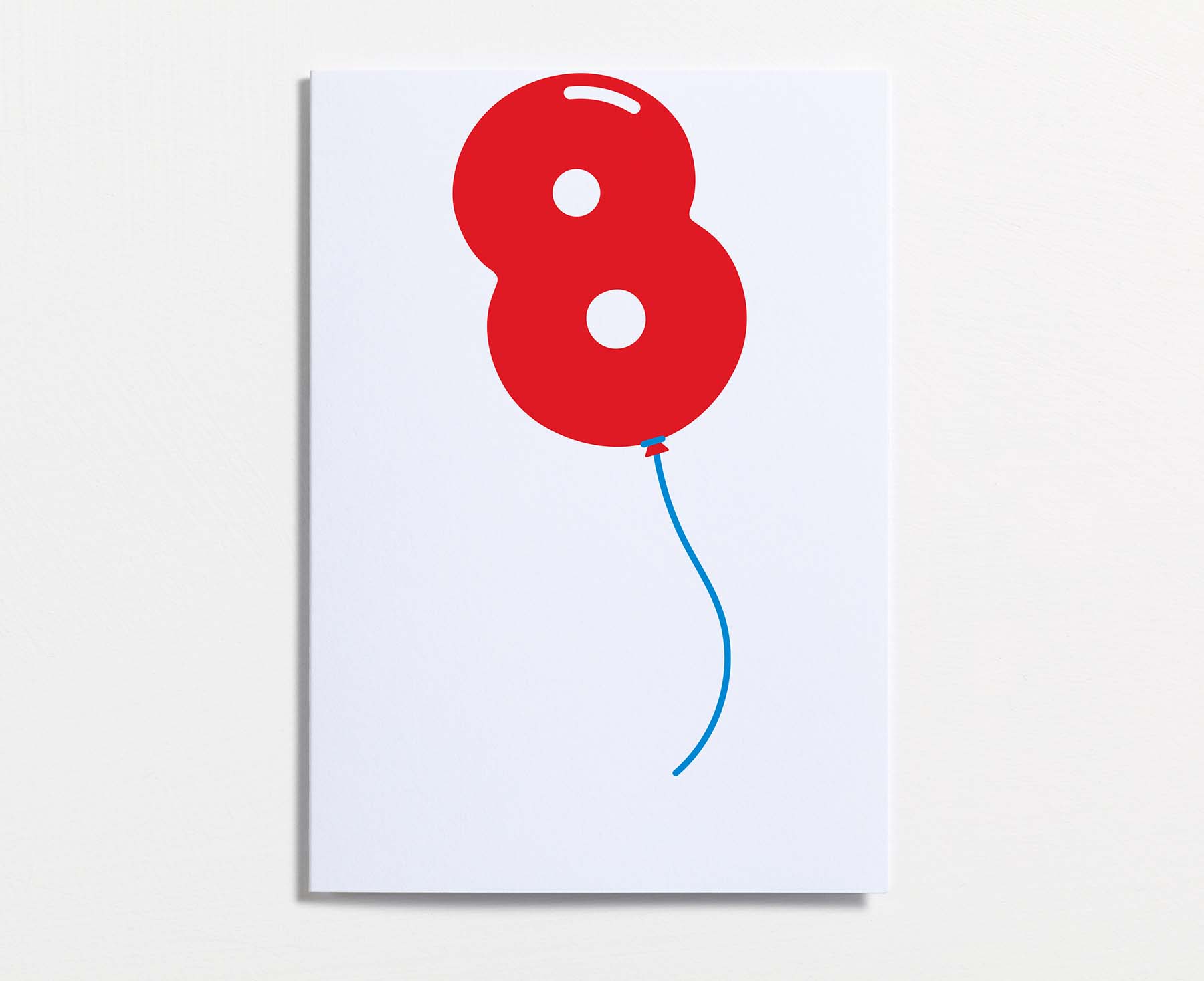 Featuring a big balloon in Crispin Finn's distinctive two colour style, this playful and fun 8th Birthday Card could work just as well as an anniversary card or to mark any other numbered milestone or achievement.