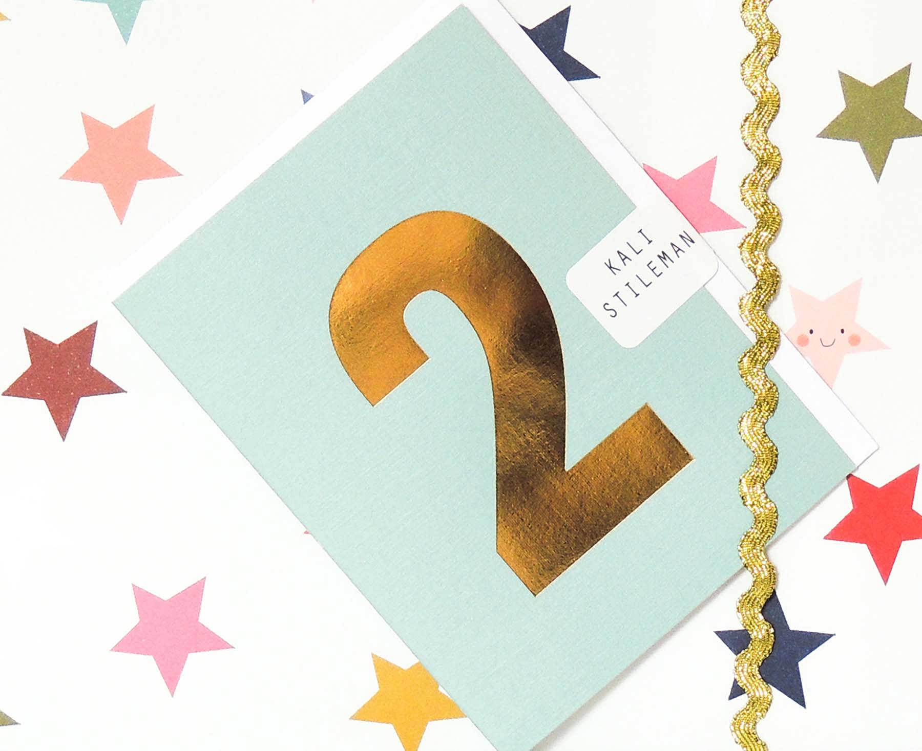 This beautiful cute gold foiled number one from Kali Stileman, with its soft blue background is ideal for 2nd birthdays or anniversaries. It's tiddly size makes it one of the cutest cards around!