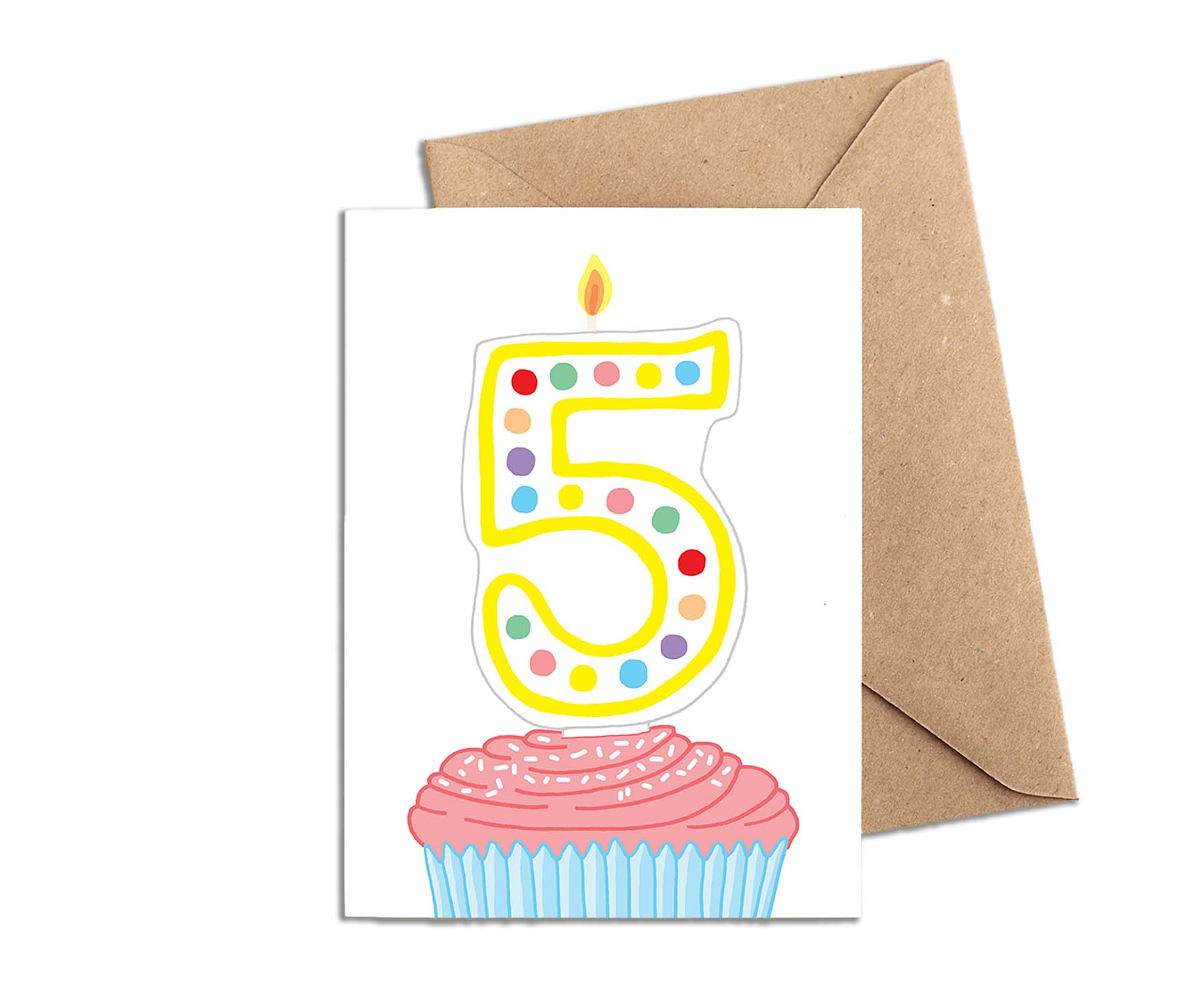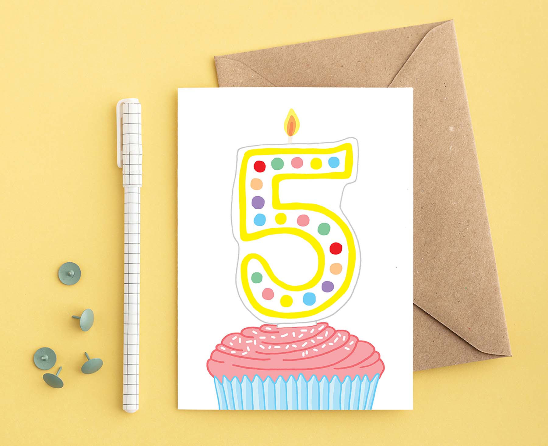 Candles and cupcakes, what more could you want for a child's birthday? This fifth birthday card, with its charming candle topped cake, is hand drawn by Pembrokeshire based You've Got Pen On Your Face and printed in the UK.