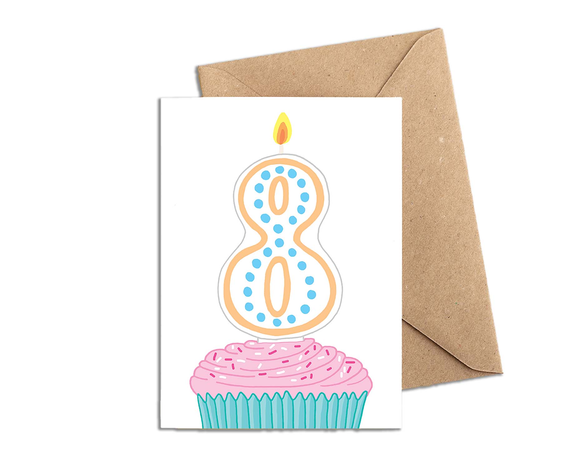 Candles and cupcakes, what more could you want for a child's birthday? This eighth birthday card, with its charming candle topped cake, is hand drawn by Pembrokeshire based You've Got Pen On Your Face and printed in the UK.