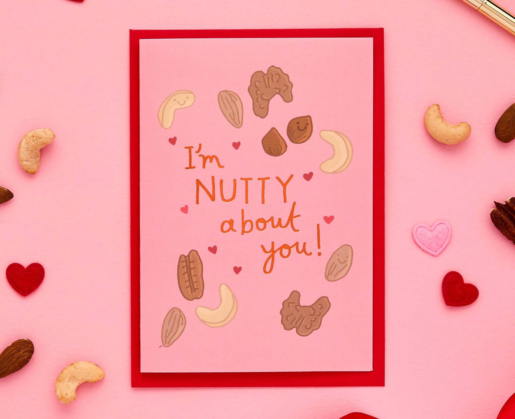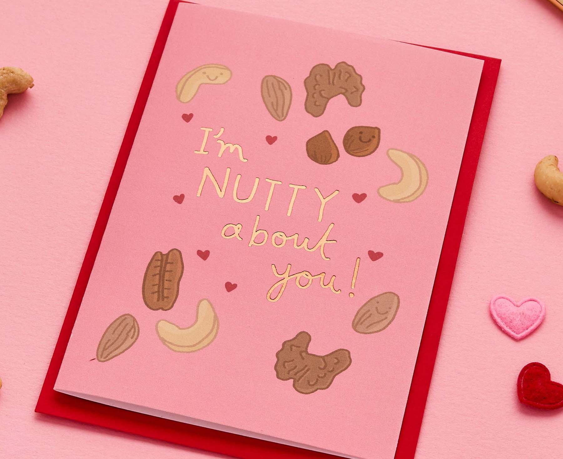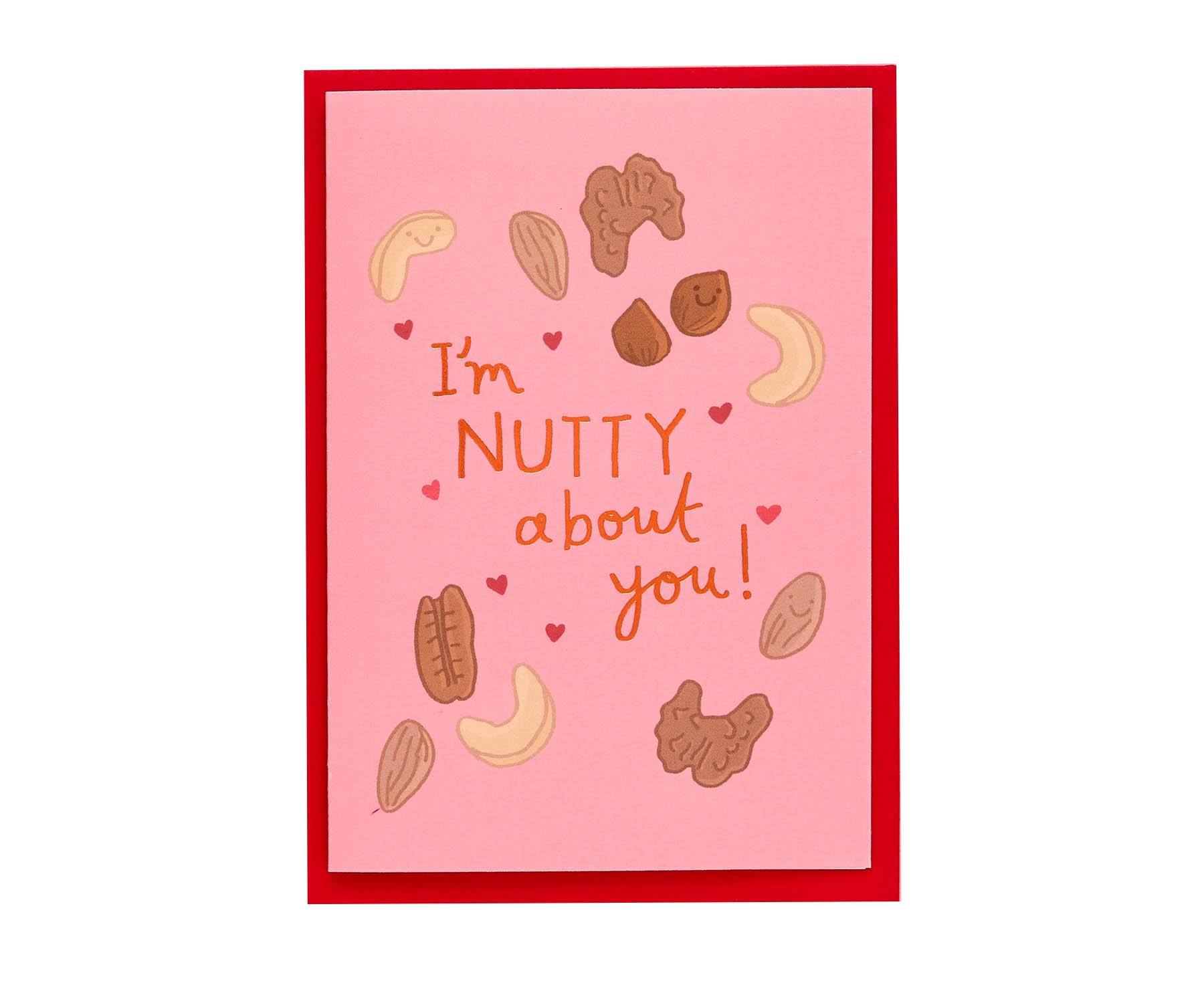 Featuring an assortment of nuts, this card is beautifully illustrated and features a hand written message in gold foil that reads 'I'm Nutty about you.' It's perfect as an anniversary or valentine's day card, or just to remind someone how much they mean to you on any day of the year. It comes with a coordinating red envelope.