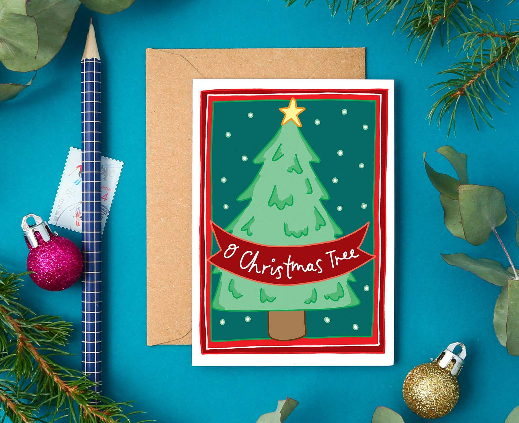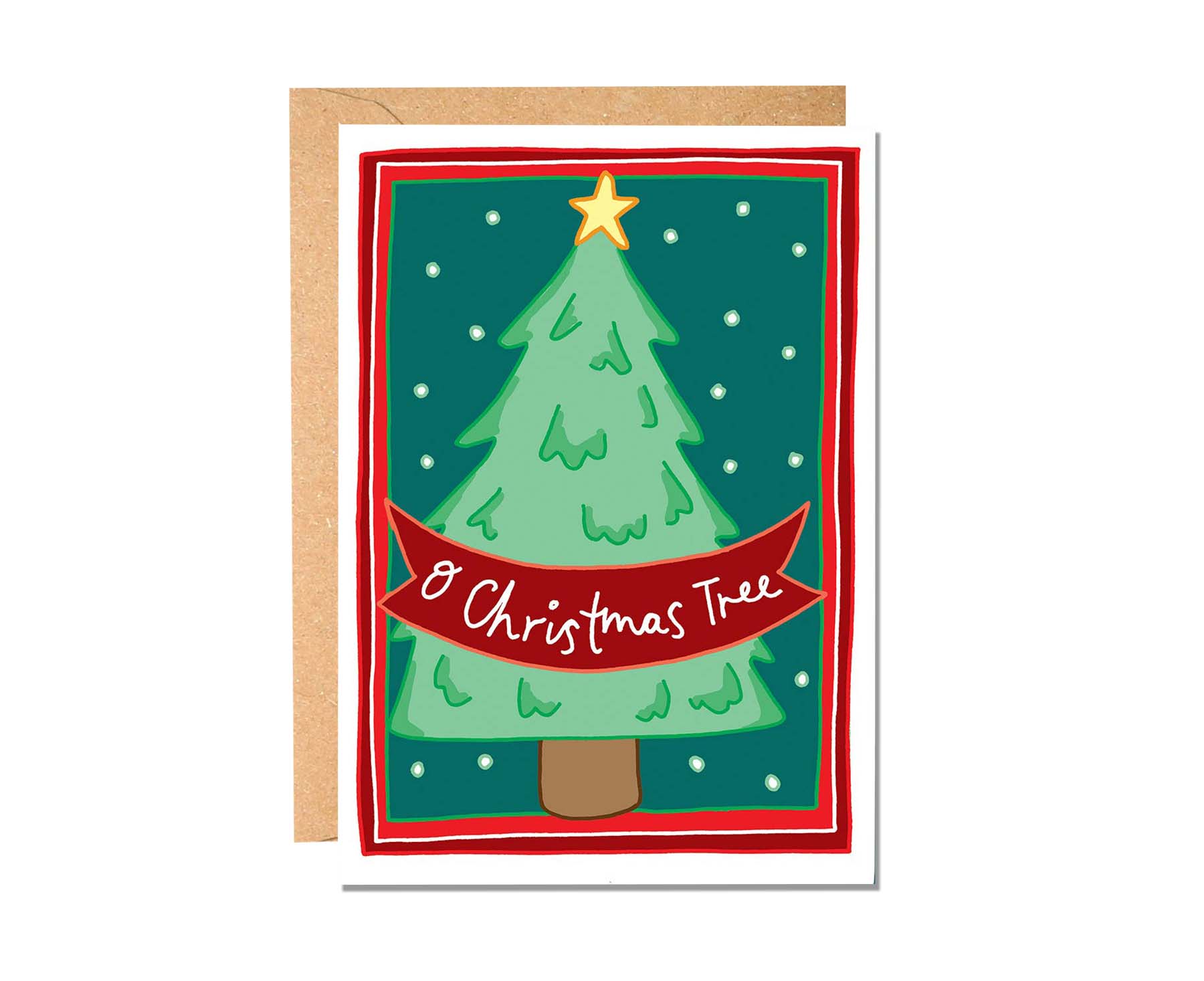Inspired by vintage matchbox designs, this cute little A7 size mini Christmas card features a beautifully illustrated Christmas tree with a ribbon that reads 'O Christmas Tree.' It would also make a rather gorgeous gift tag.