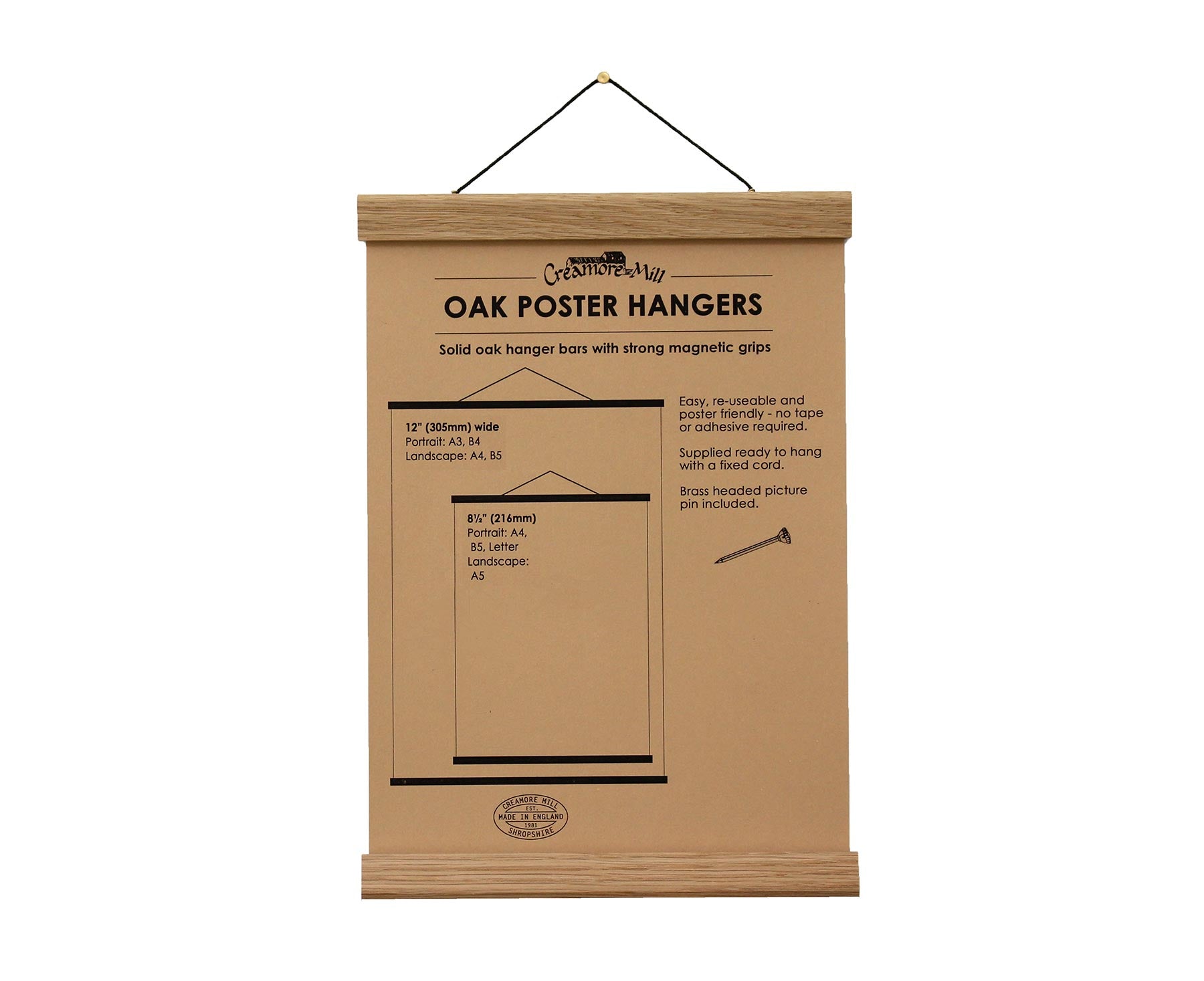 Solid oak poster hangers, supplied with brass headed tack, small size 21.6cm wide, regular size 30.5cm wide. Made in the UK.