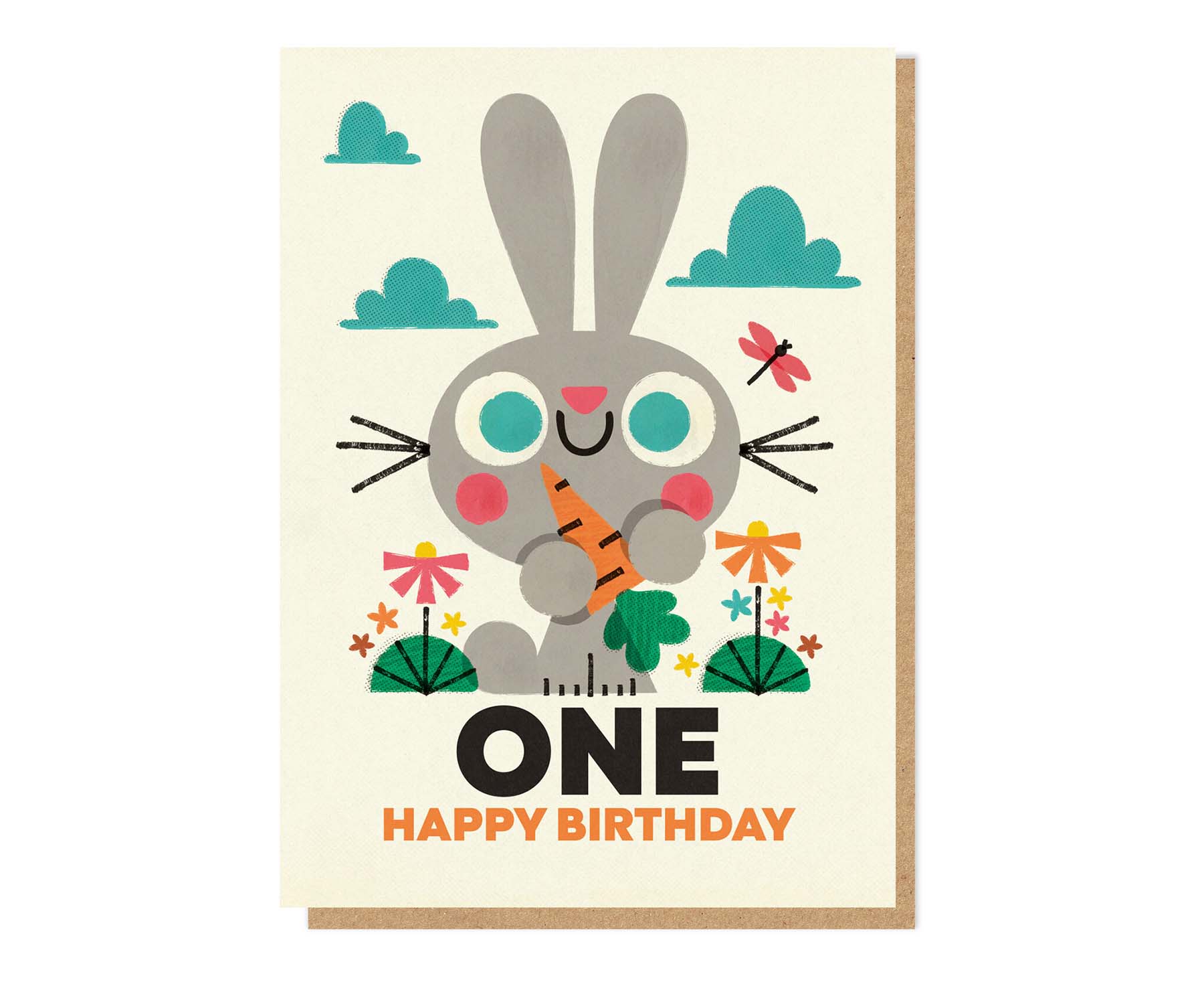 Part of Stormy Knight's collaboration with Spanish design duo Pintachan, this cute carrot loving Bunny number one 1st birthday card is full of retro charm and the spot UV gloss details really make it shine.