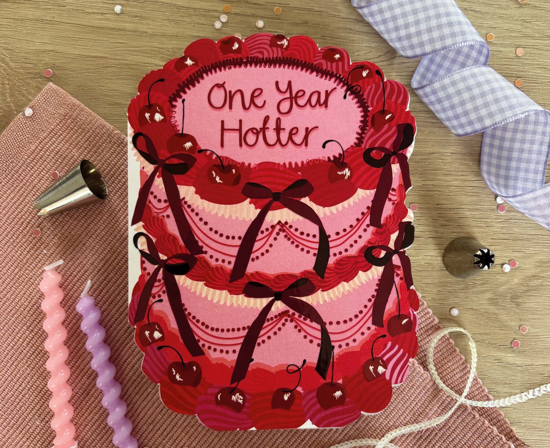 With bows, cherries and 'One Year Hotter' text highlighted in spot varnish, this racy red cake shaped birthday card is perfect to celebrate your favourite hotty's birthday. It's one of Two for Joy Illustration's delicious range of cake shaped cards.