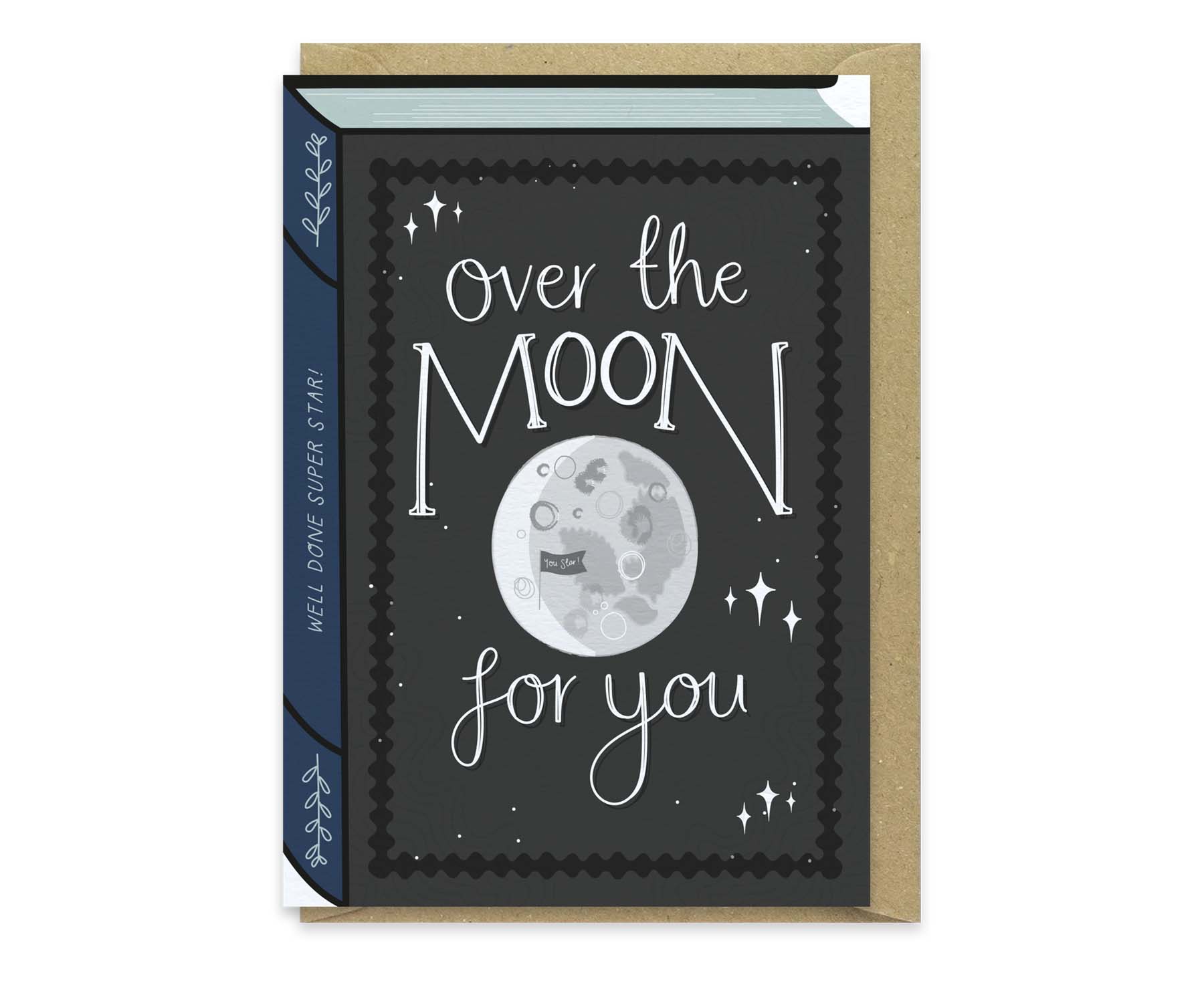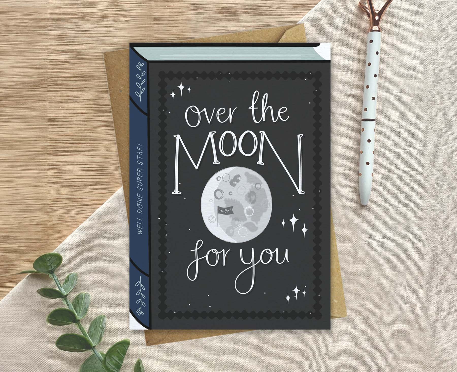 Inspired by classic book covers, this beautifully illustrated congratulations card features a moon and space design with hand lettering that says 'Over the Moon for you' with an additional message on the spine - 'well done super star.' There's a gorgeous complementary moon design printed on the inside. It's one of many book inspired designs by Two for Joy Illustration.