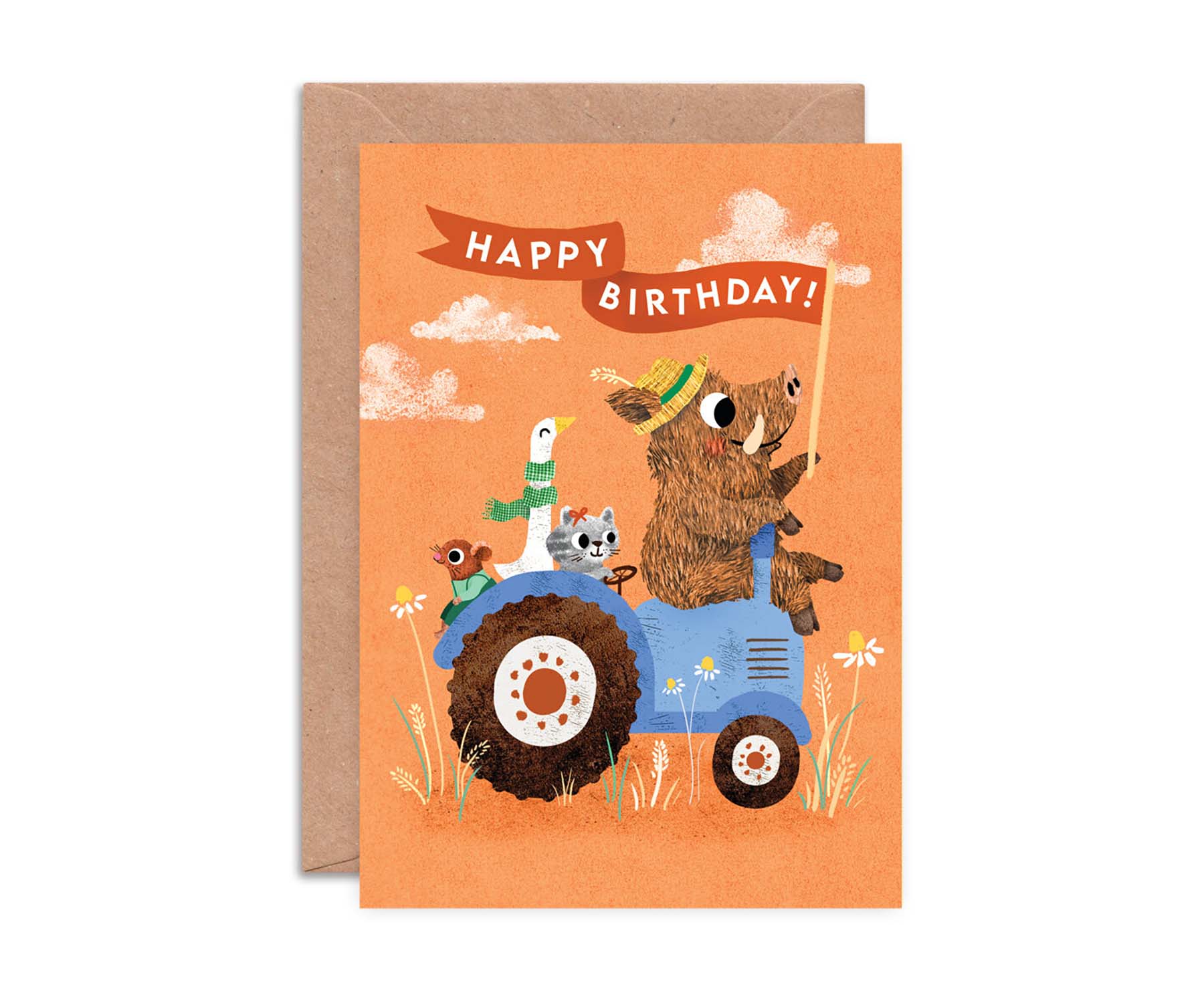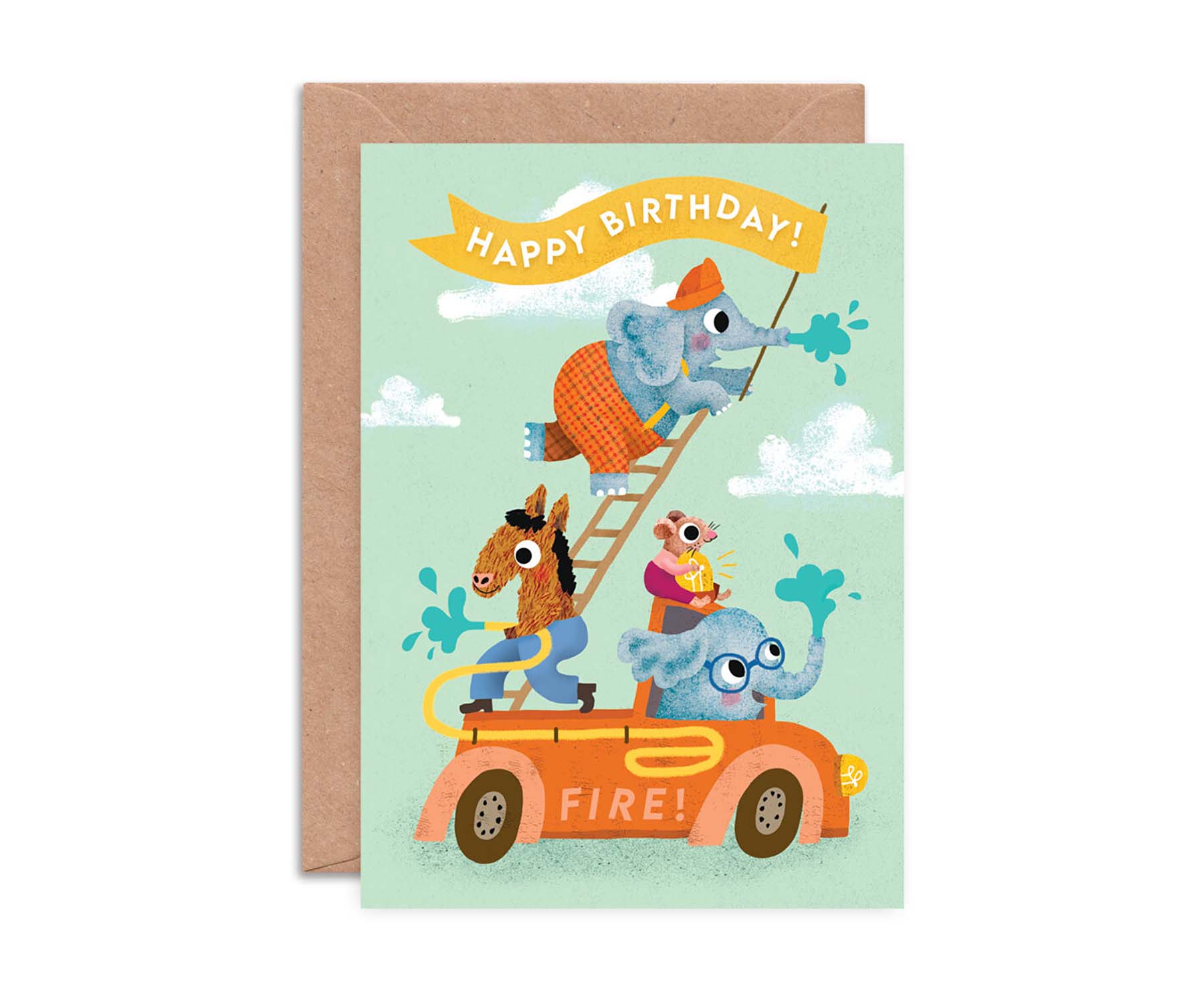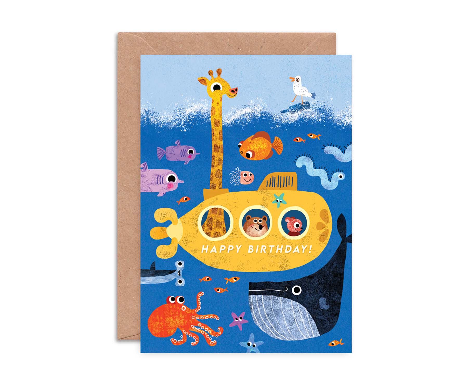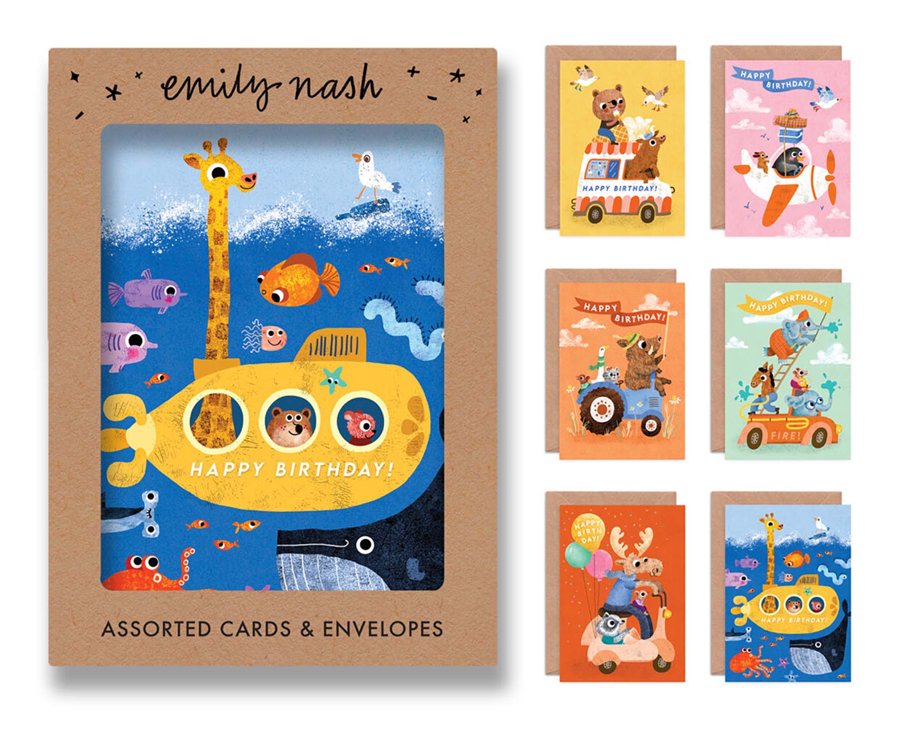 A pack of six cards each featuring some beautifully hand illustrated animals using various modes of transport by Emily Nash, this fun pack of birthday cards is perfect for kids. Supplied in a presentation box the cards feature the following cards - ice cream van, airplane, tractor, fire engine, motorbike and submarine.