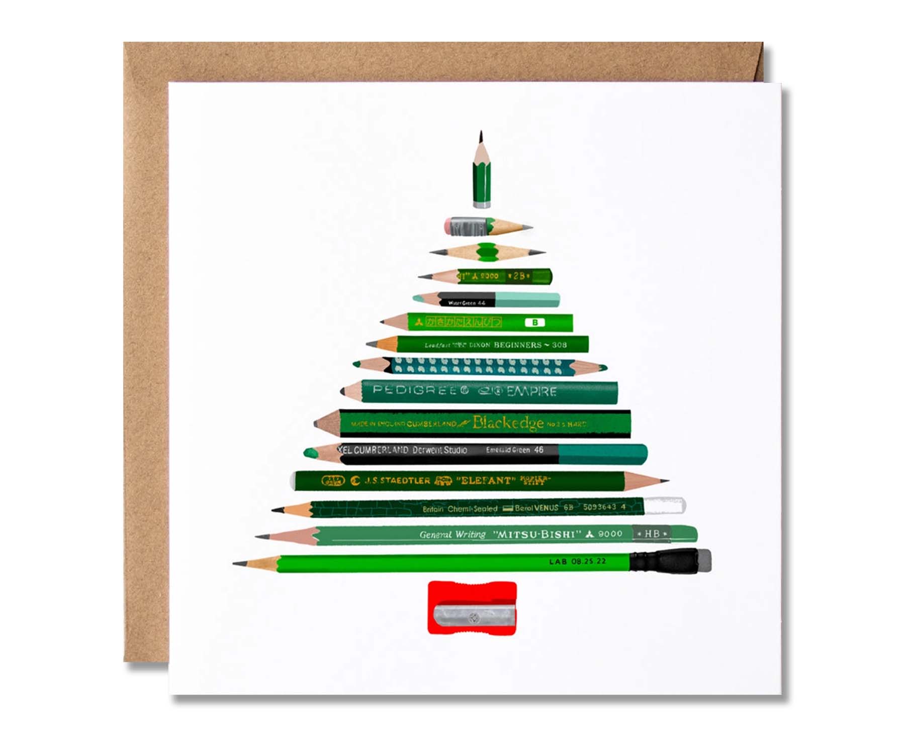 Expertly illustrated by Norfolk based Design Smith, this fun square Christmas card features a Christmas tree made out of green pencils and a pencil sharpener base, making it perfect for any stationery lover. It's printed on a heavyweight uncoated card and comes with a kraft envelope.