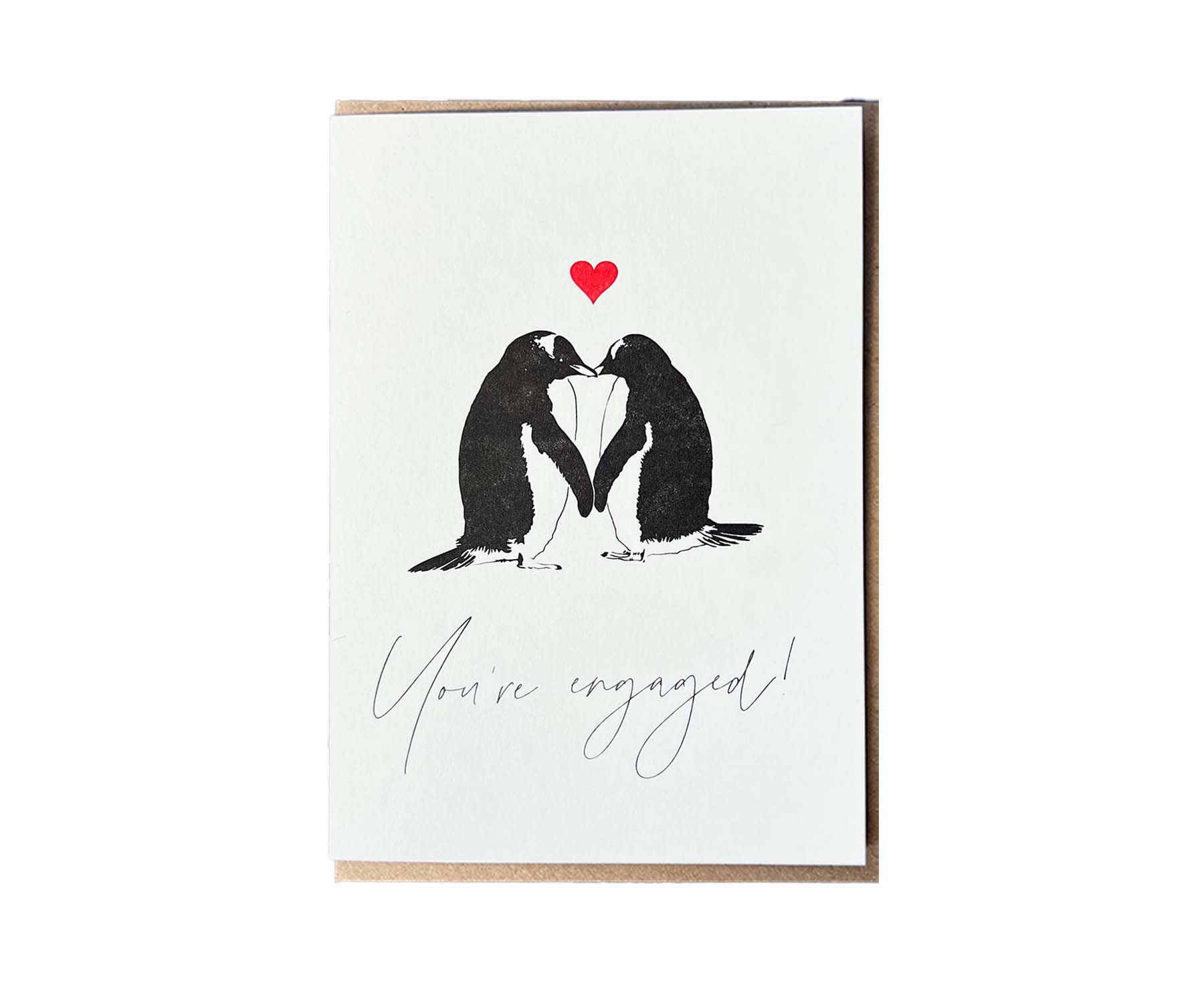 Congratulate that special newly engaged couple in the cutest way with this letterpress engagement card, featuring a gorgeous pair of hand holding penguins and their little red loveheart. All Penguin Ink cards are Letterpress printed in England using a traditional Heidelberg press, giving them a tactile embossed finish on a thick textured card stock.
