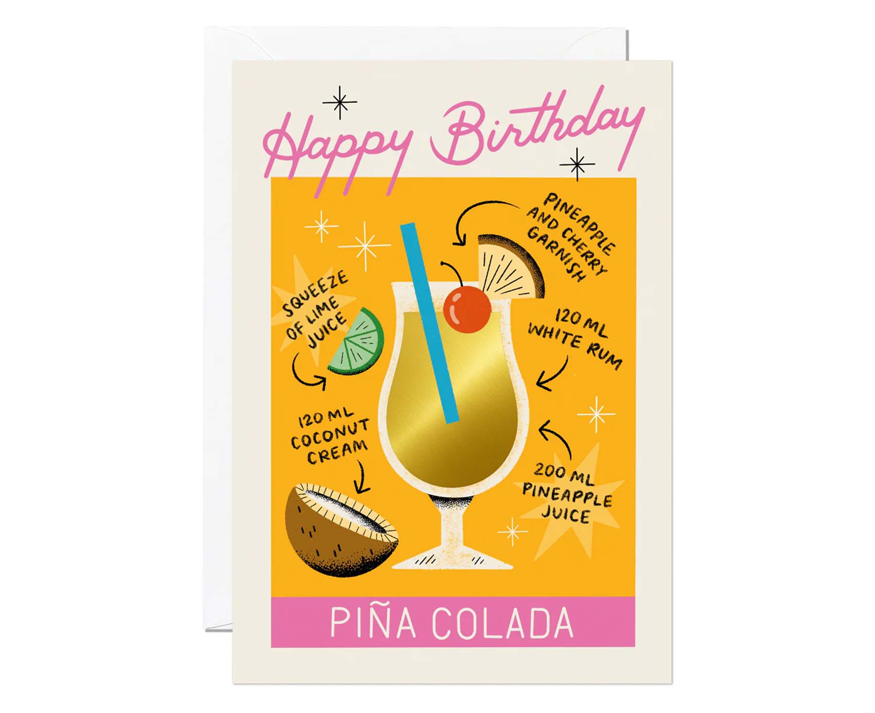 One of a range of foiled cocktail cards designed in collaboration with Megan Roy, this Pina Colada cocktail birthday card has glorious gold foiling and tells you all you need to make this classic poolside cocktail. Like all Ricicle Cards it is printed in the UK on sustainable stock and comes with a suitably luxurious envelope.