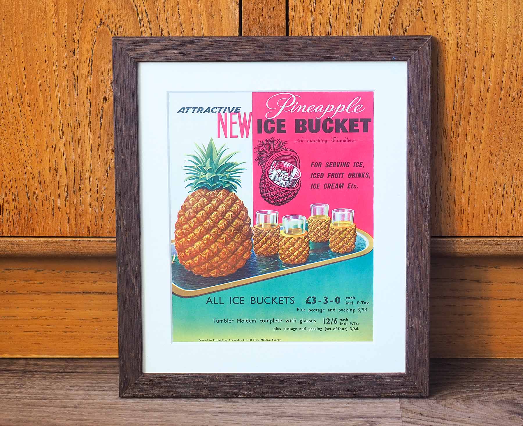 A beautiful kitsch little advert from the 1960s for a Pineapple Ice Bucket with matching tumblers by Featherfoam Ltd. Expertly mounted and framed in a dark walnut stained wood frame, this would make the perfect addition to your home bar or cocktail cabinet. As with all of our vintage items, it is a genuine original item, no reproductions or reprints here!