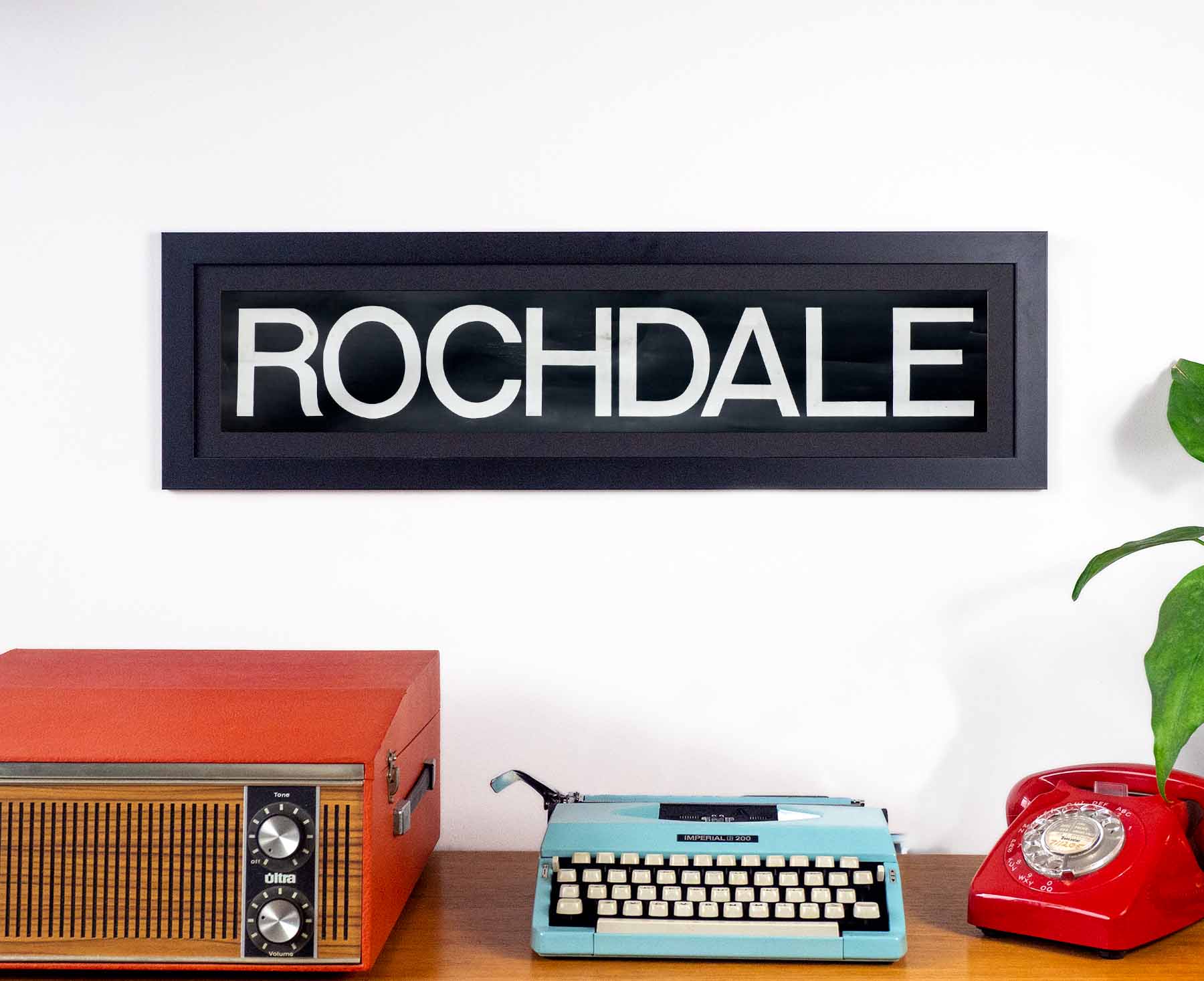 This genuine original Rochdale bus blind was produced in 1977 for bus routes around Stockport and Manchester. It has signs of its age, such as creases and other marks, but we think this just makes it even more beautiful.