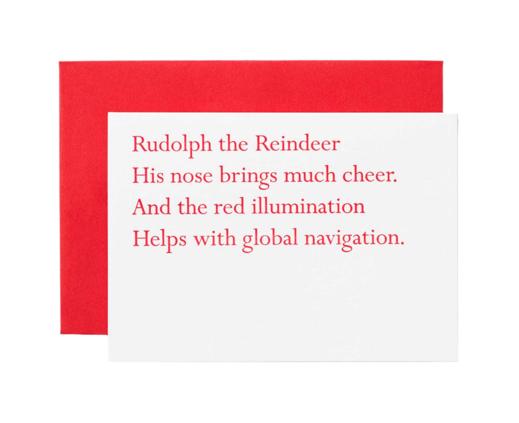 Printed using a distinctive Risograph printer in their Liverpool studio, this fun Christmas card by Jot is a Clerihew on the subject of everyone's favourite reindeer. A Clerihew is a biographical poem invented by Edmund Clerihew Bentley, featuring four lines and brilliantly forced rhyme. The card is printed on a 300gsm sustainable stock and comes with a matching bright red envelope.