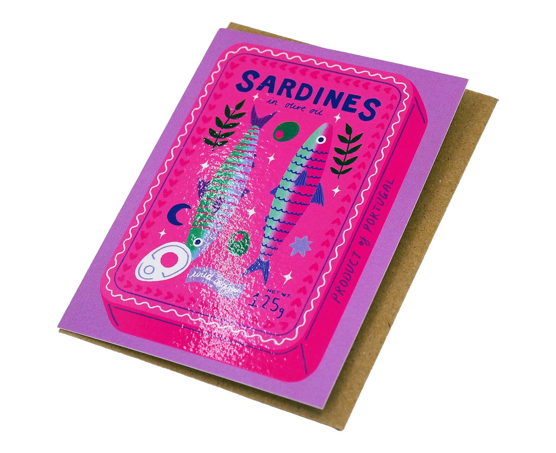 Part of Earlybird's kitsch Little Trinkets range of mini cards designed by Amy Hastings, this Sardines card, with its spot varnished details, is perfect for all sorts of occasions or just because.
