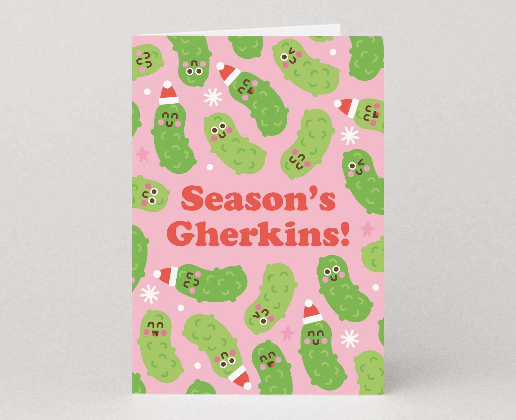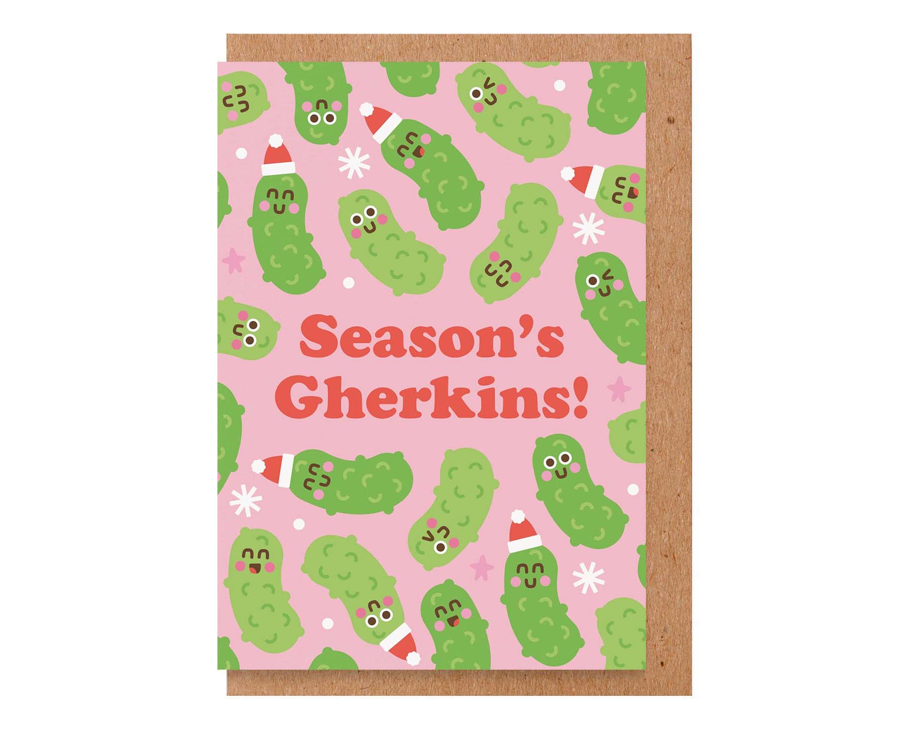No need to get in a pickle choosing a Christmas card for your foodie friends. This cute gherkin filled Christmas card by Studio Boketto is perfect, with the cutest festive gherkins you've ever seen and the caption 'Season's Gherkins!'