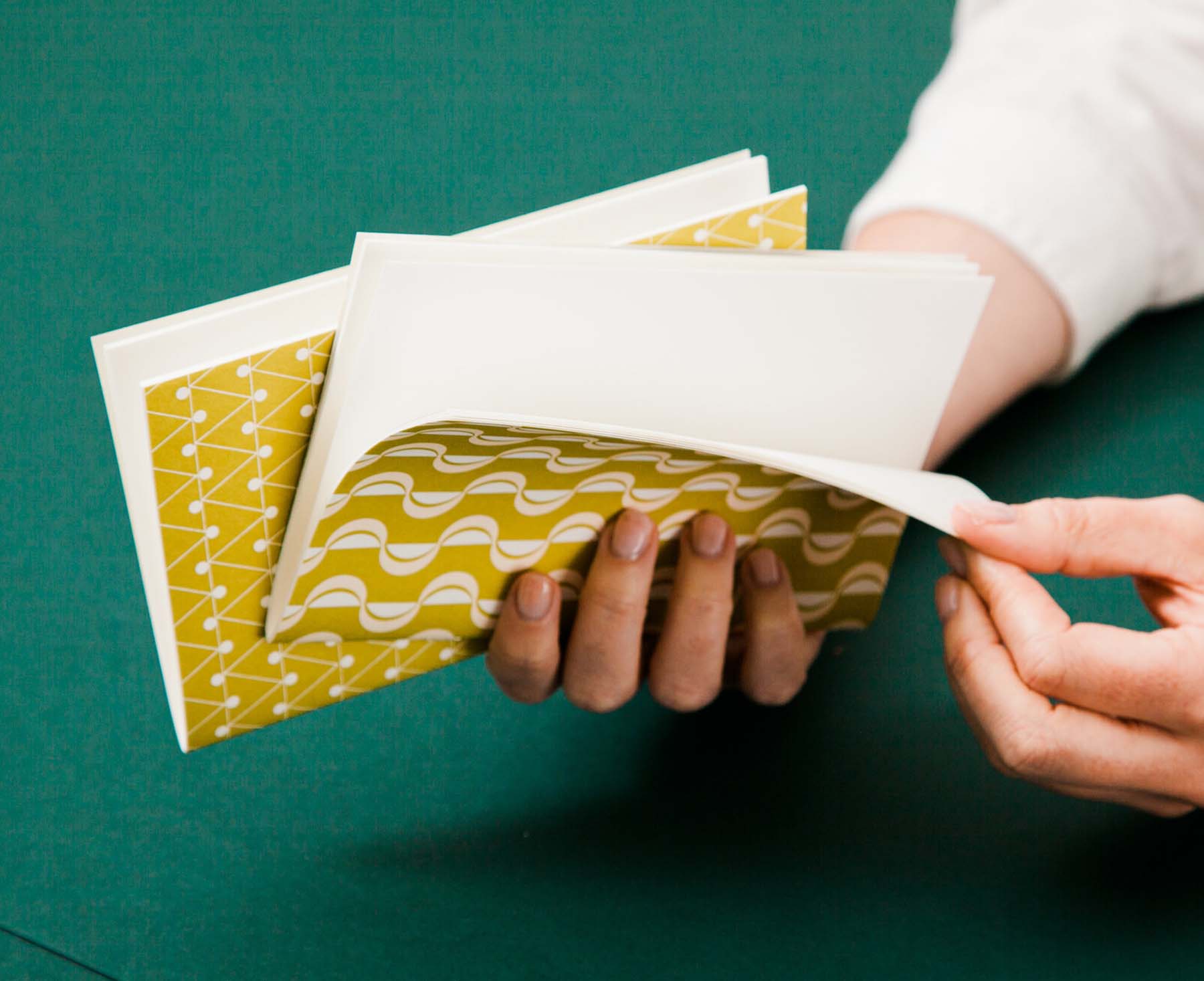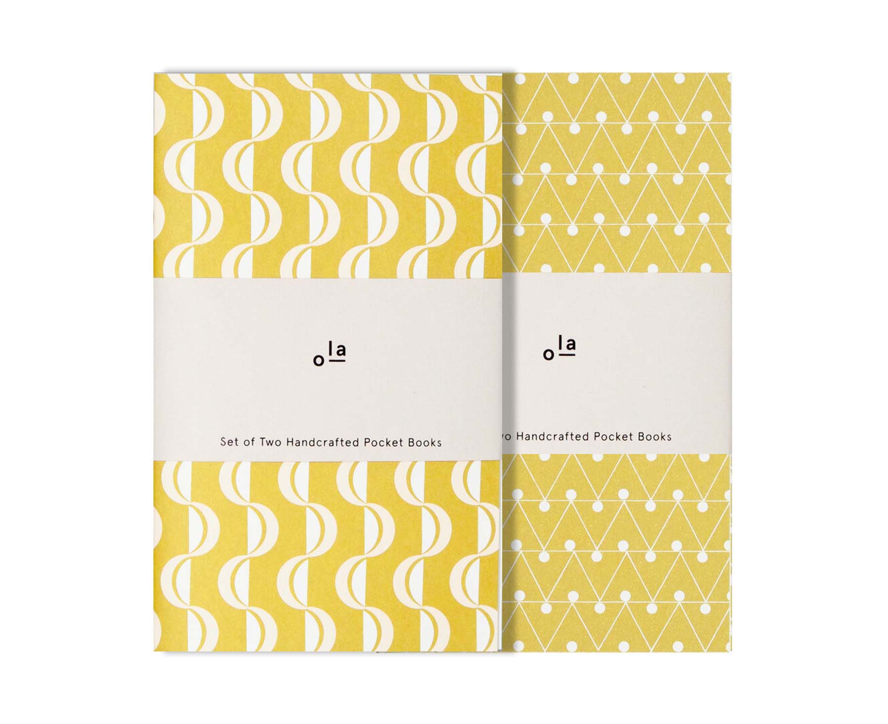 The heavyweight covers feature two of ola's signature patterned papers, Chartreuse Wave in Yellow and Green & Dash in Leaf Green, and feature a simple hand-foiled logo to the reverse. Each book contains 32 pages.