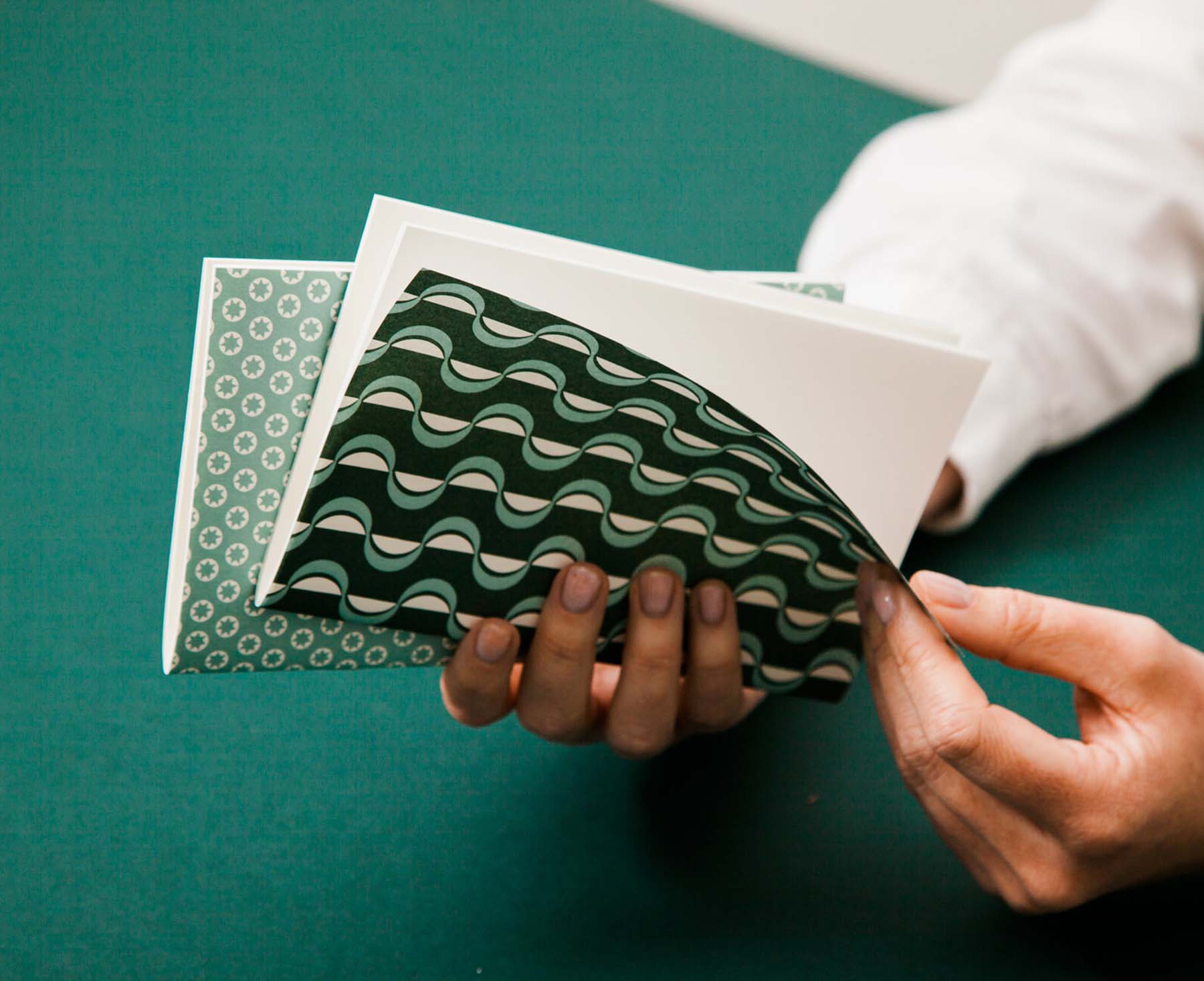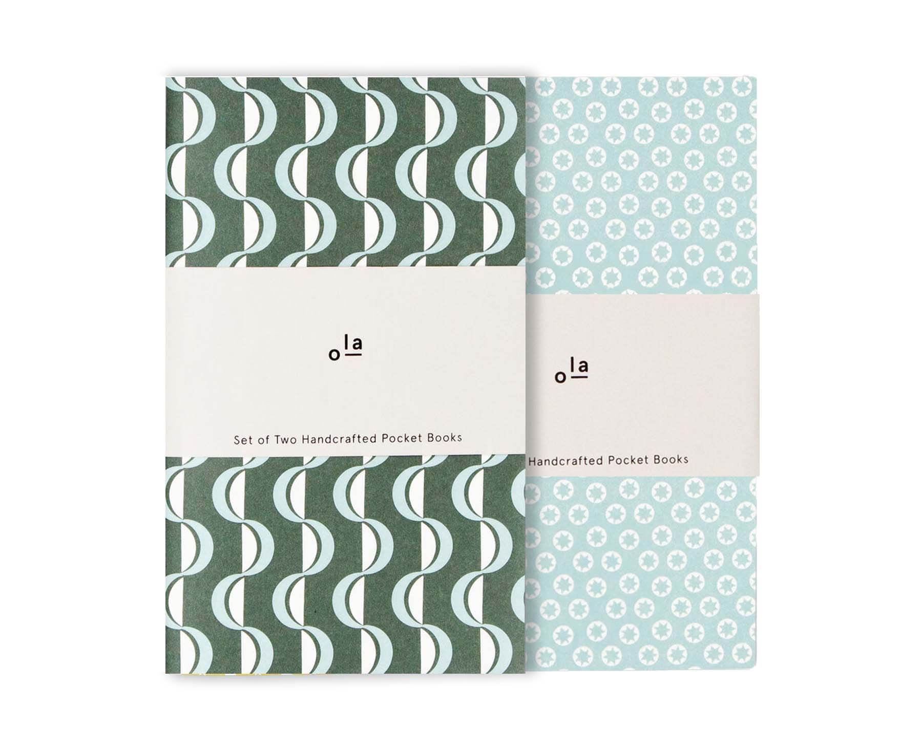 The heavyweight covers feature two of ola's signature patterned papers, Forest Green Wave & Tiny Stars in Turquoise, and feature a simple hand-foiled logo to the reverse. Each book contains 32 pages.