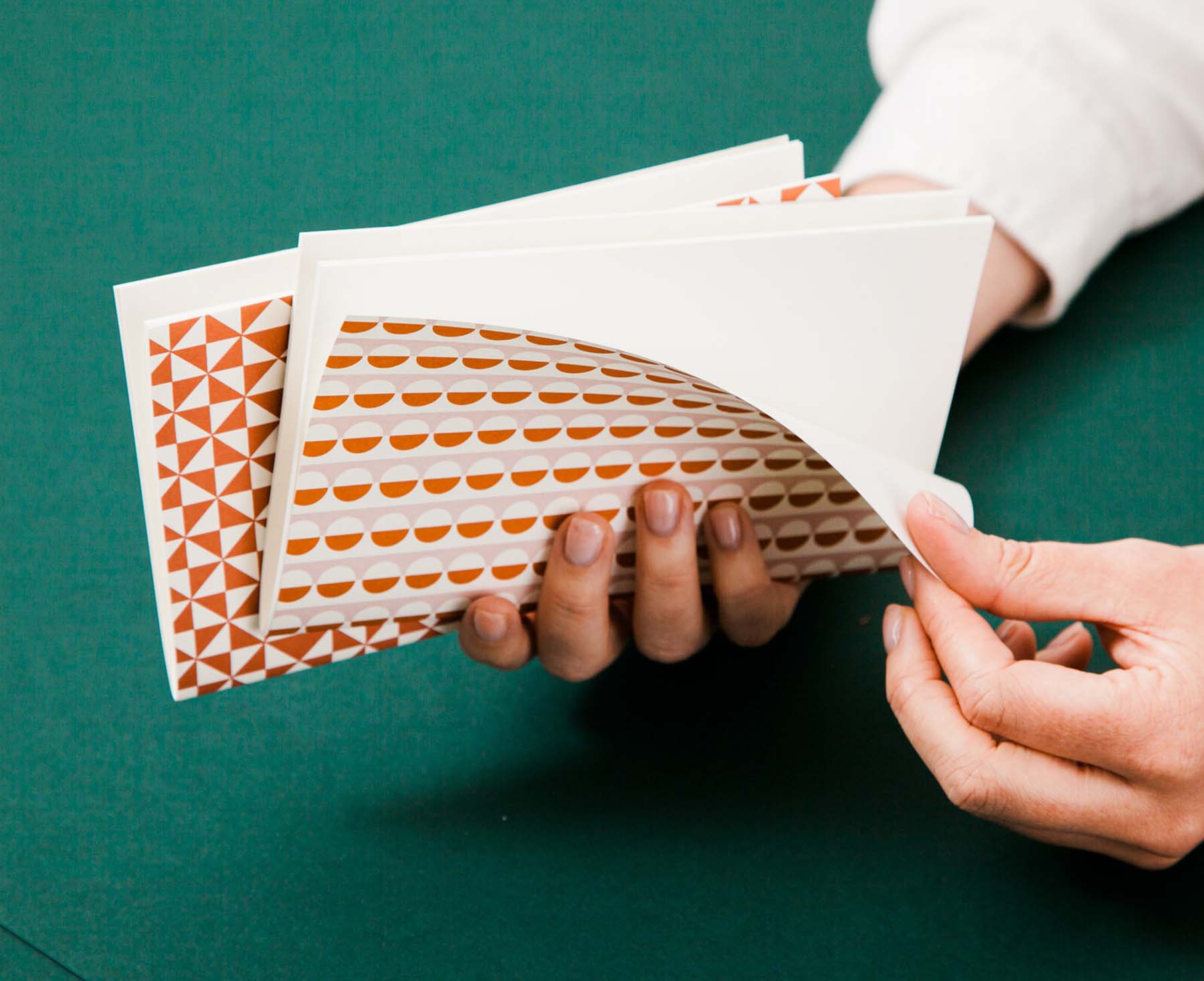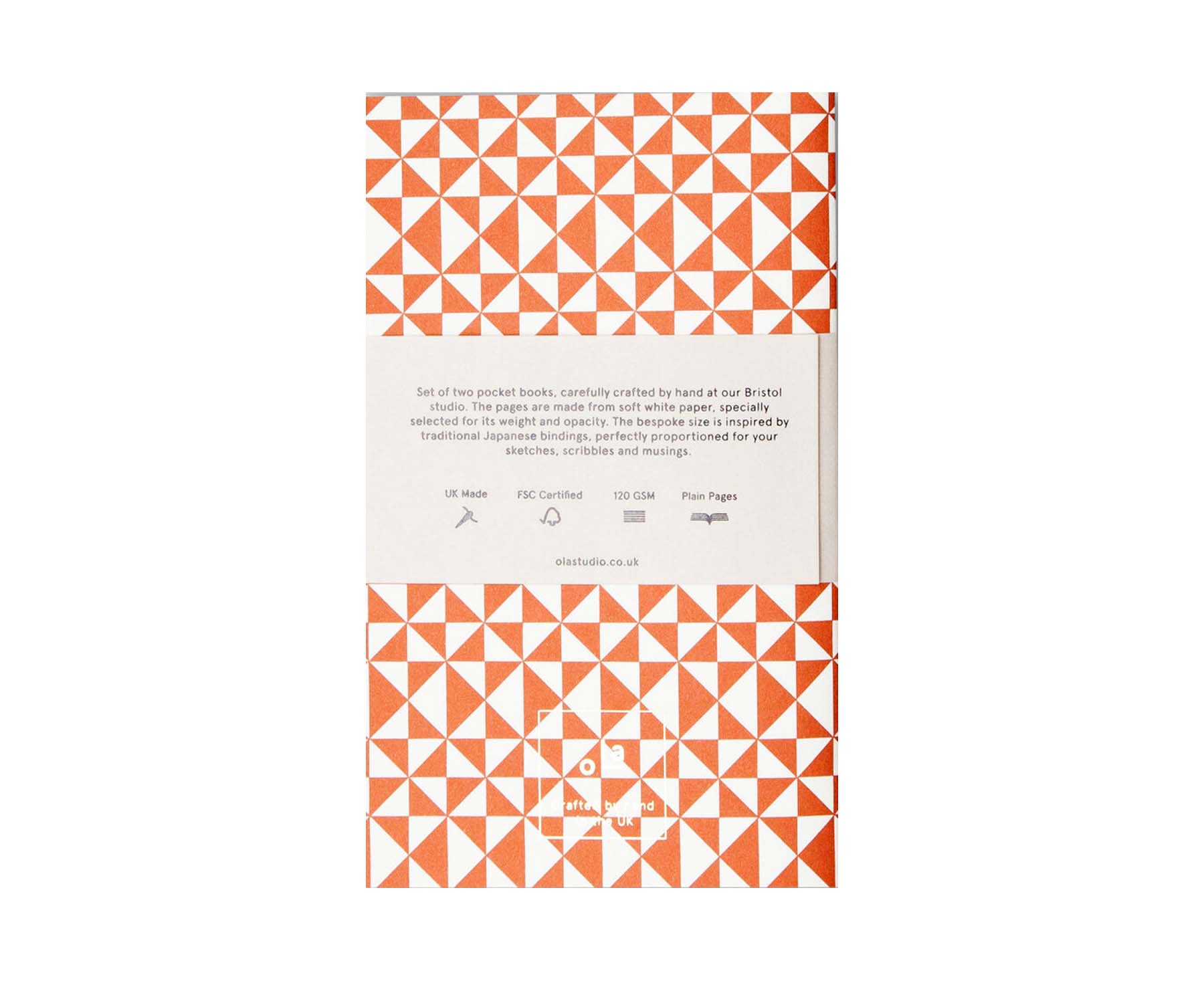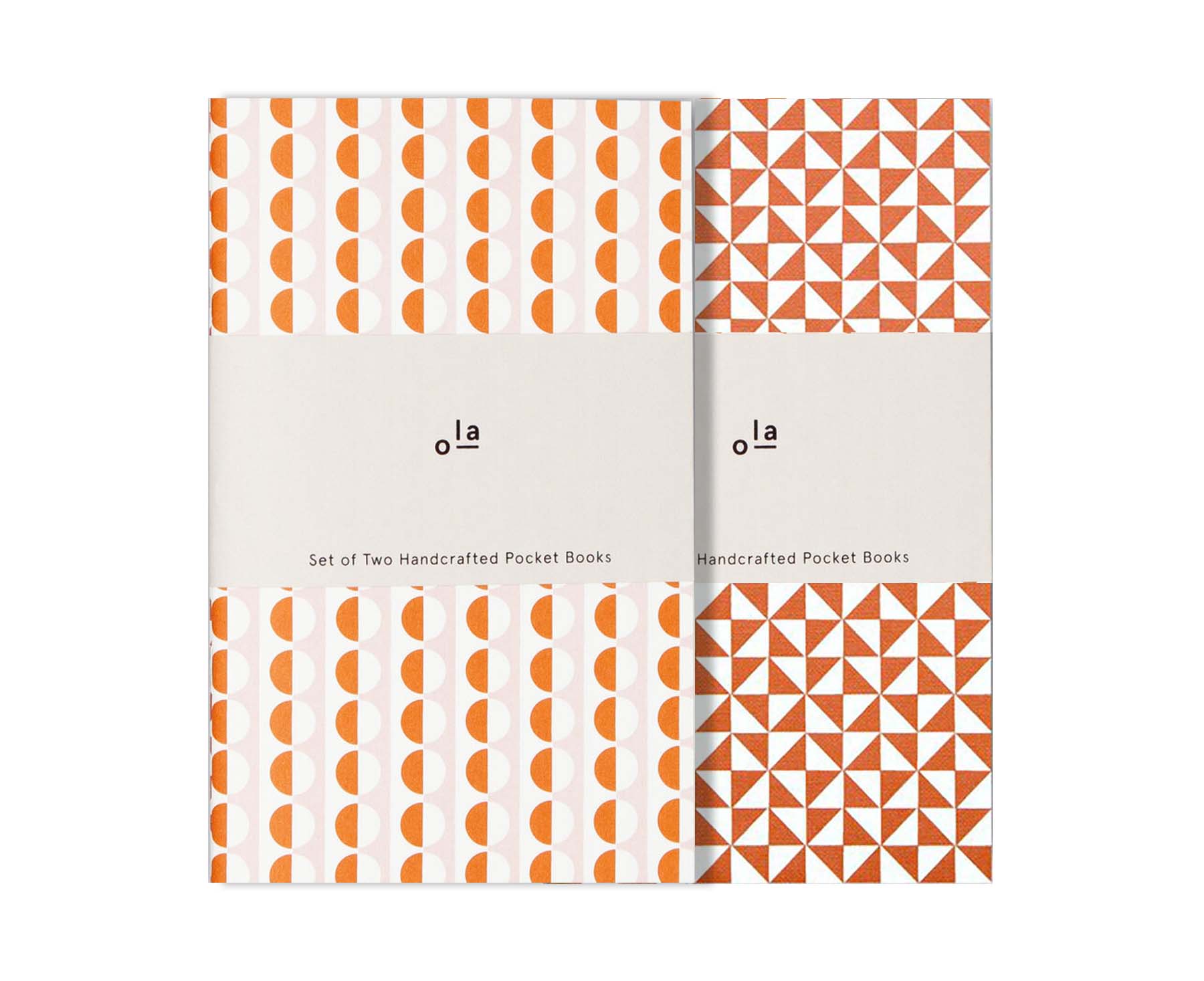 The heavyweight covers feature two of ola's signature patterned papers, Sophie in Pink and Orange & Kaffe in Brick Red, and feature a simple hand-foiled logo to the reverse. Each book contains 32 pages.