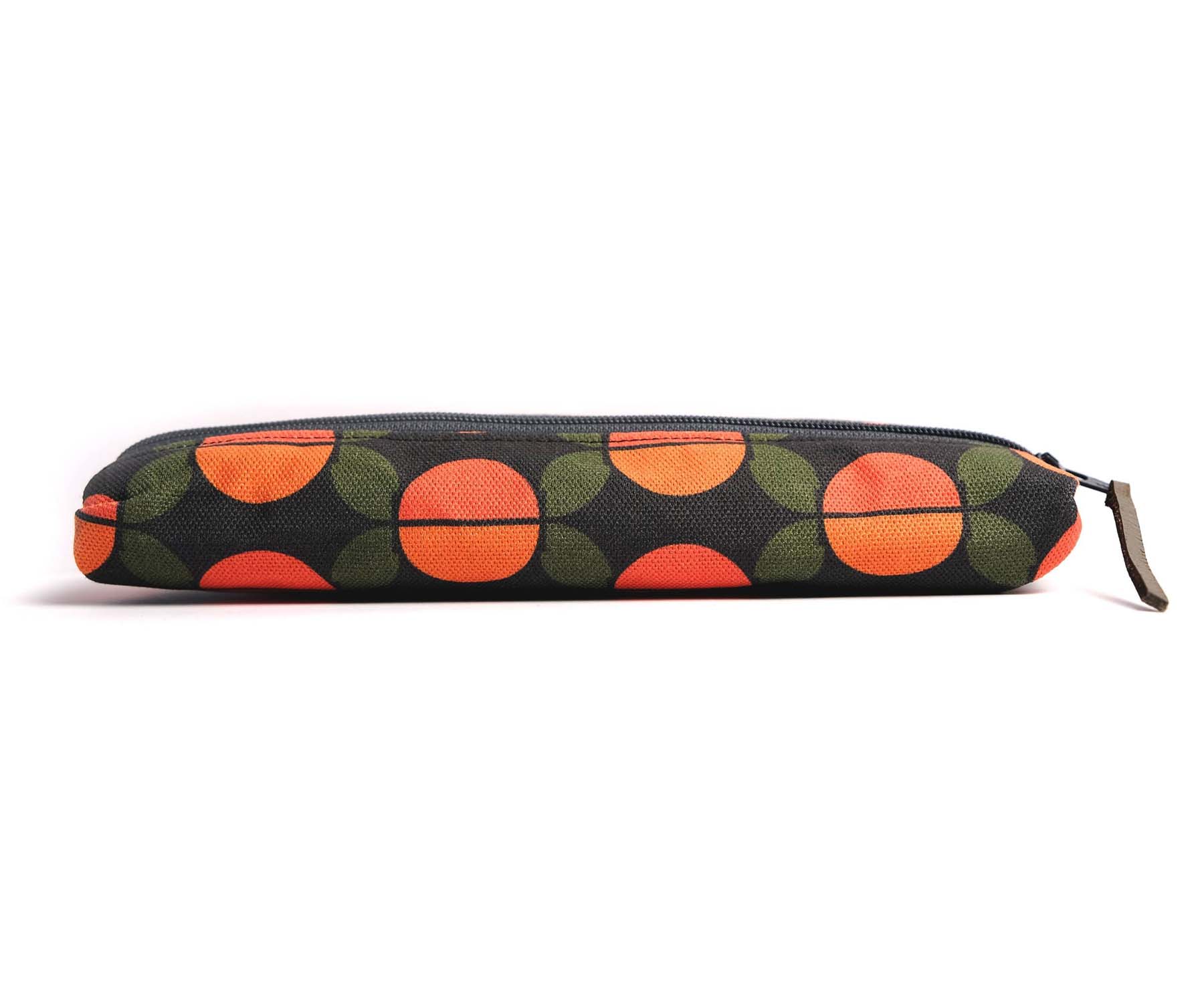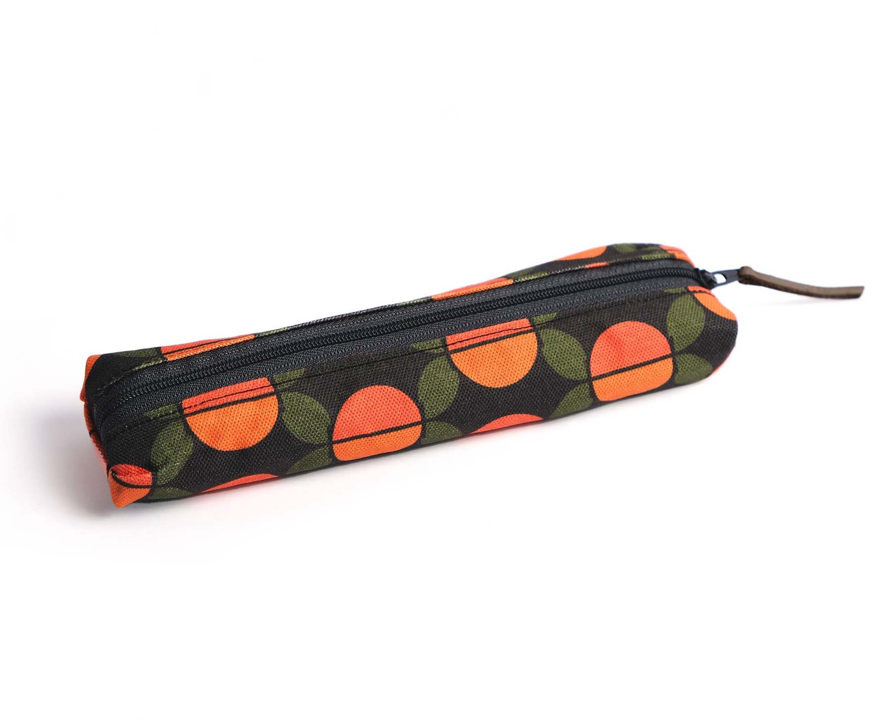 This gorgeous zipped pouch pencil case is the perfect home for your favourite pens and pencils. Sustainably handmade in Scotland, it features one of Storigraphic's Seventies themed patterns in orange and green. It's built to last with a YKK zip and leather pull.