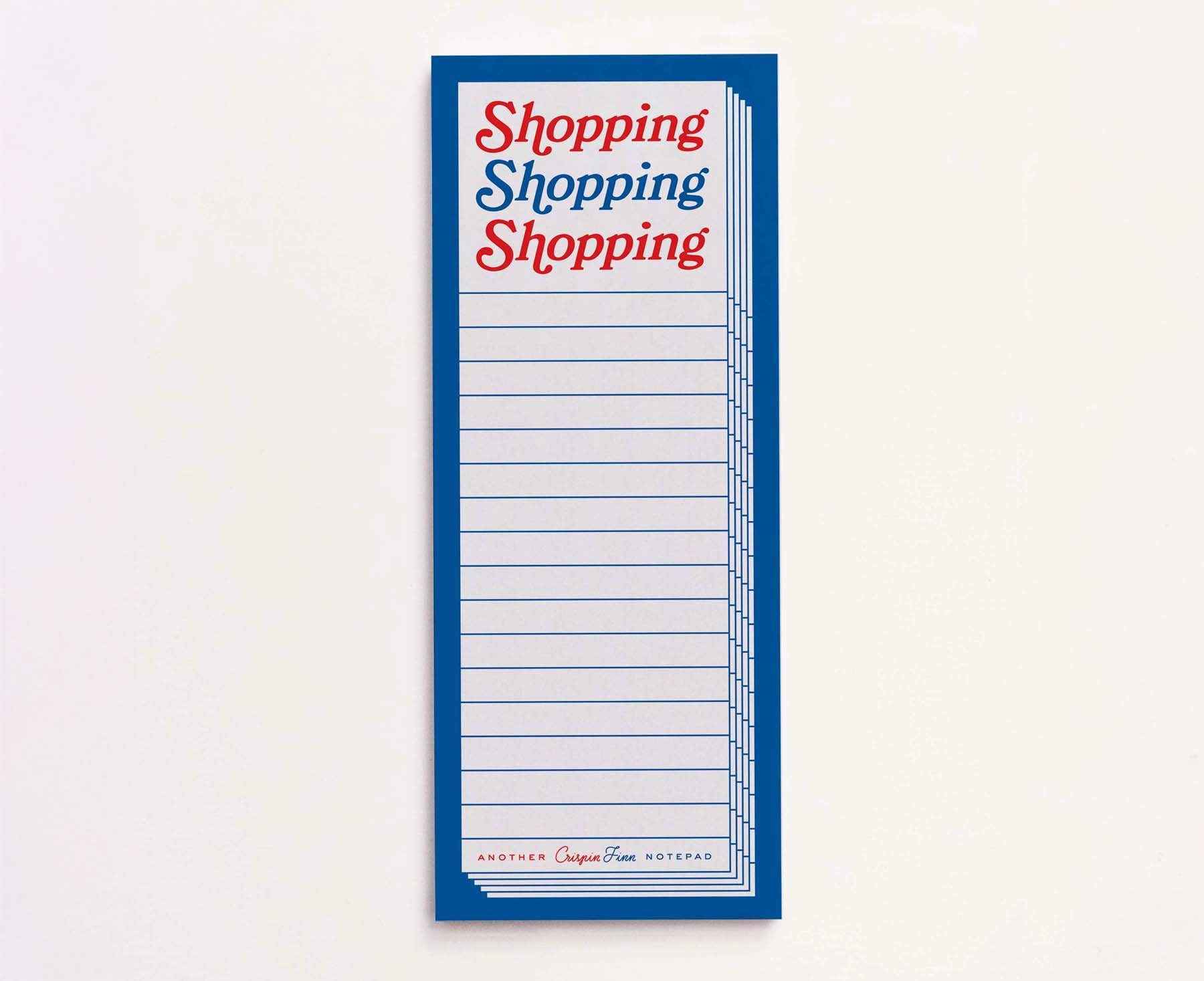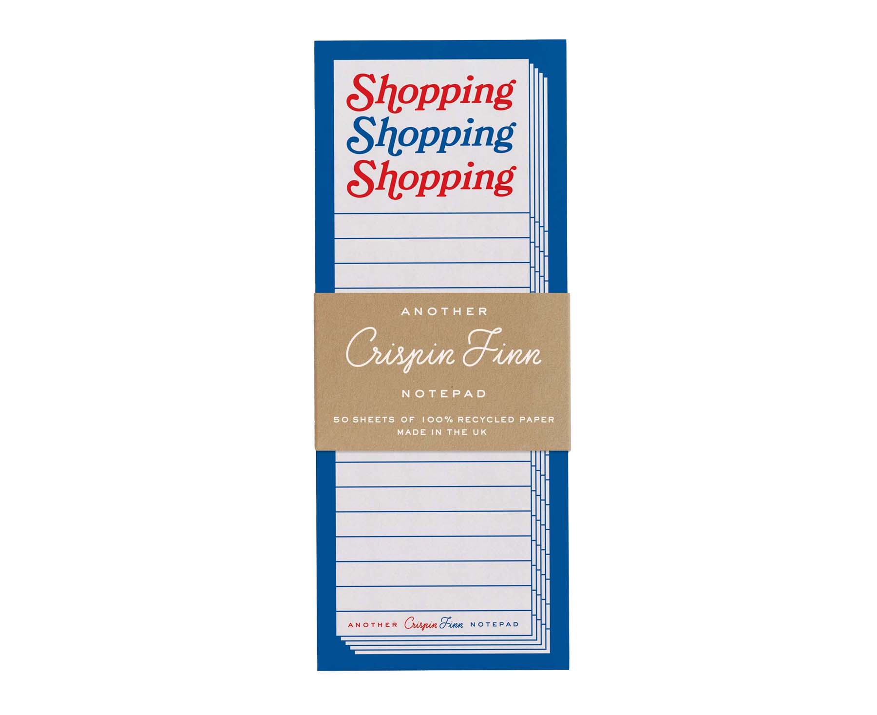 Shopping - an activity so good, they named it three times! Part of Crispin Finn's fun notepad range, this playful pad is perfect for all your shopping lists, beautifully illustrated in their trademark red, white and blue style. There are 50 tear off pages printed on 100% recycled 120gsm paper.