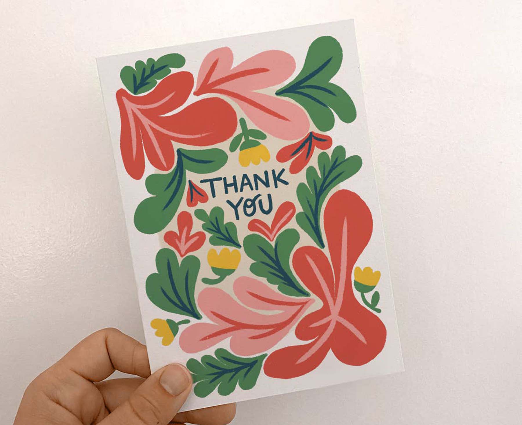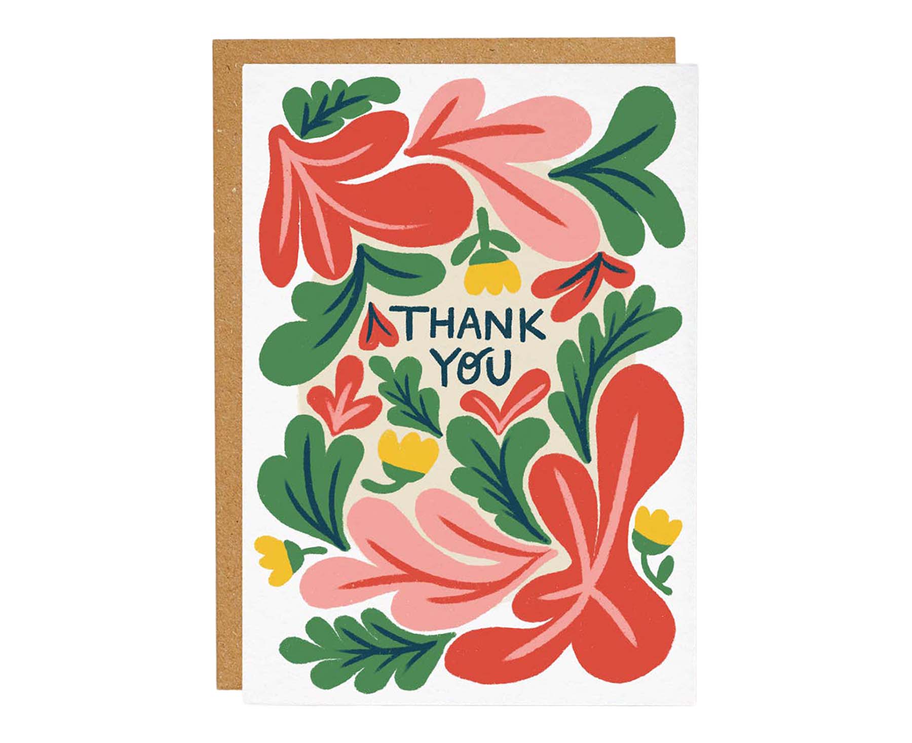 Featuring a hand lettered 'thank you' in the middle of a bold red, pink and green leafy floral design, Tthis beautiful thank you card is by illustrator Jade Fisher.
