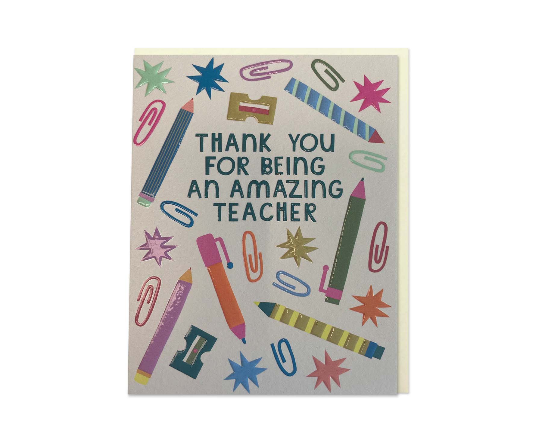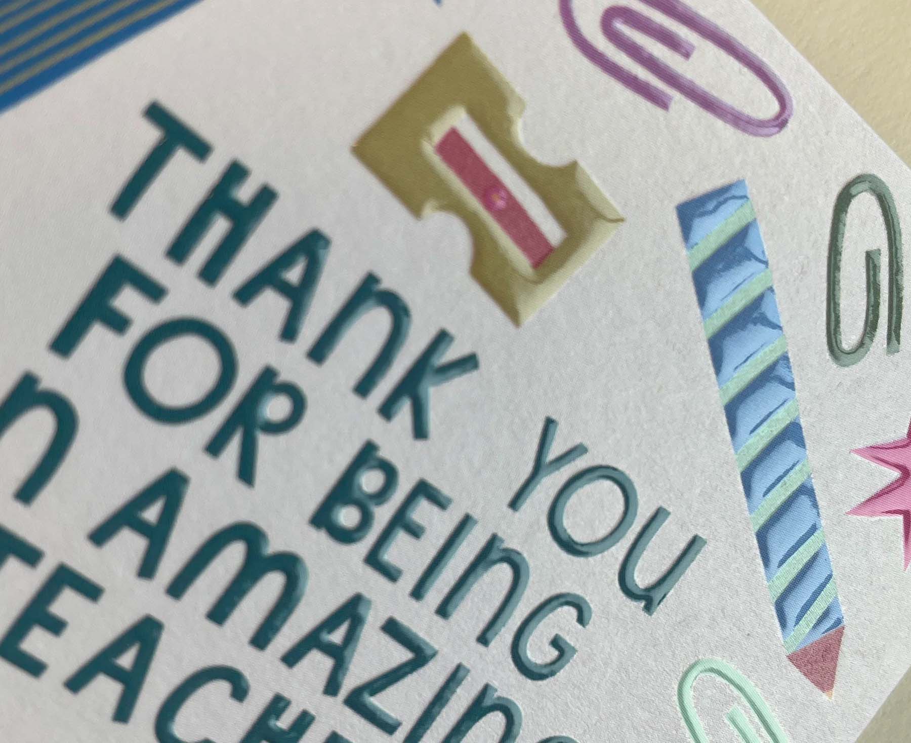 Thank an amazing teacher at a school near you with this colourful mini card featuring embossed pens, pencils, sharpeners and paper clips and Thank You To An Amazing Teacher lettering. Part of Raspberry Blossom's Little Joys range of cute mini cards.