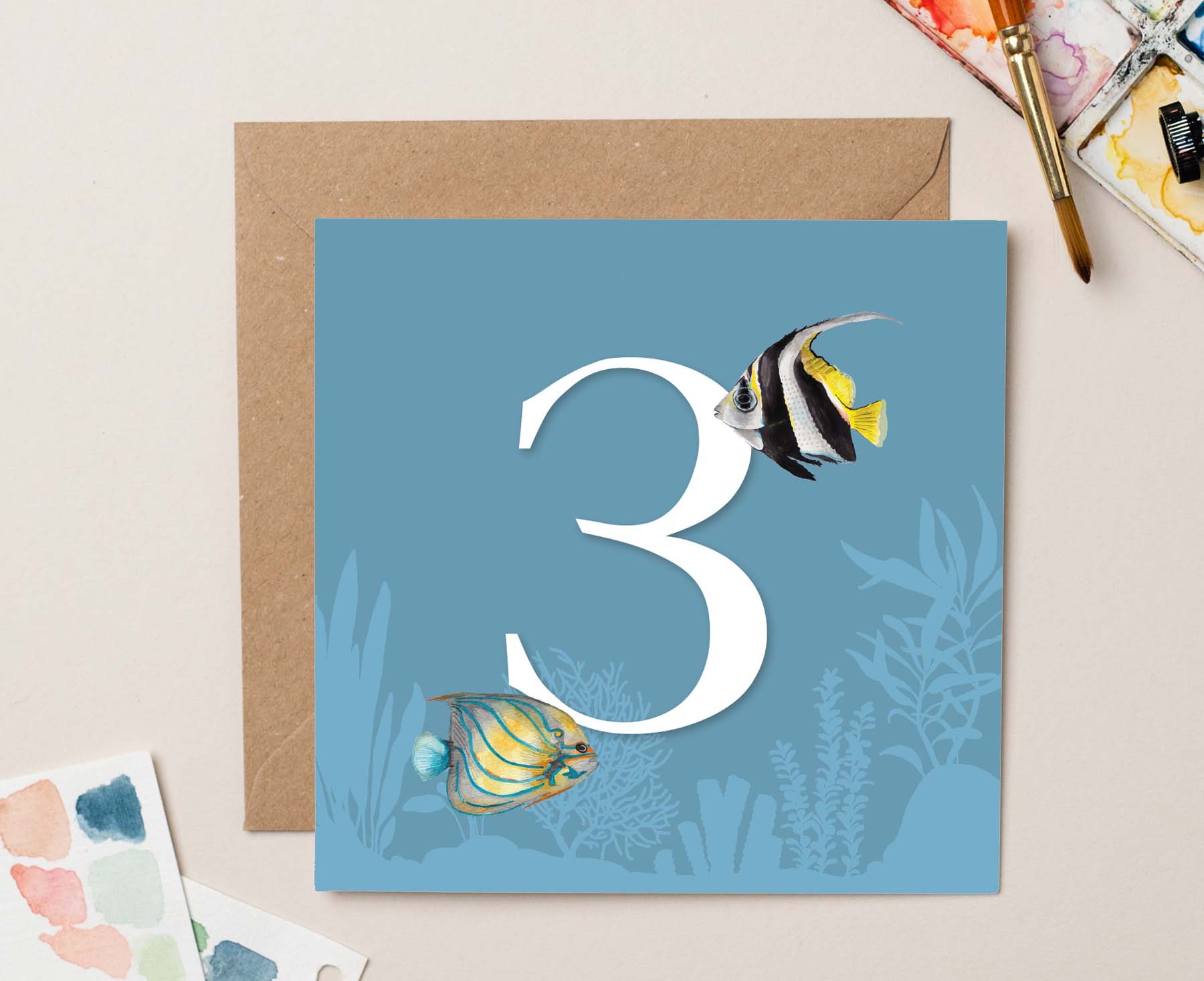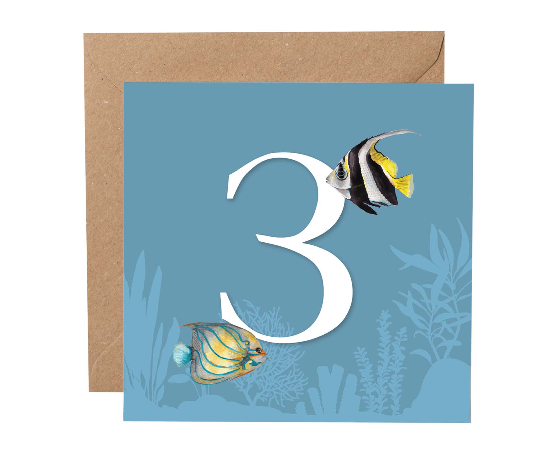 This elegant third birthday card features a graceful pair of tropical fish swimming around a number three. It's based on an original watercolour painting by talented Sussex based artist Georgi, otherwise known as lil wabbit.