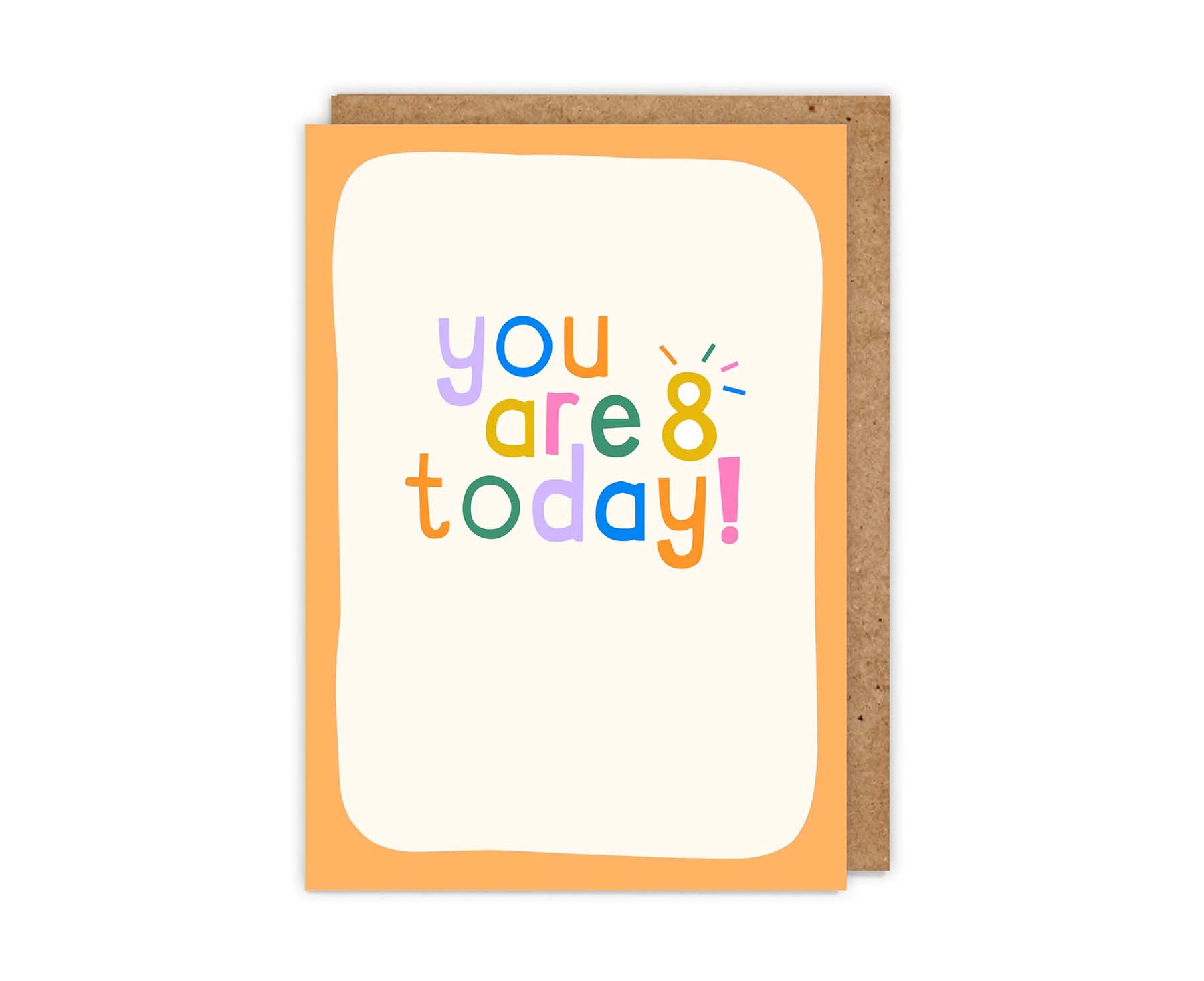 Featuring Zoe Spry's trademark colourful hand lettering, this 8th Birthday Card proudly proclaims the big day!